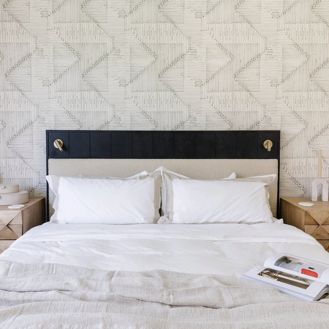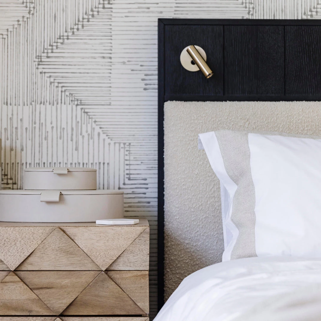 Pushing the boundaries in both style and functionality, this storage bed will light up your night – literally – thanks to two conveniently positioned reading lights in a satin-brass finish. A plush upholstered headboard panel in a durable ivory boucle fabric offers a soft, tactile detail to balance the bold styling. Making efficient use of the platform bed design, the footboard is home to two push-to-open drawers, offering additional storage for smaller, modern spaces.