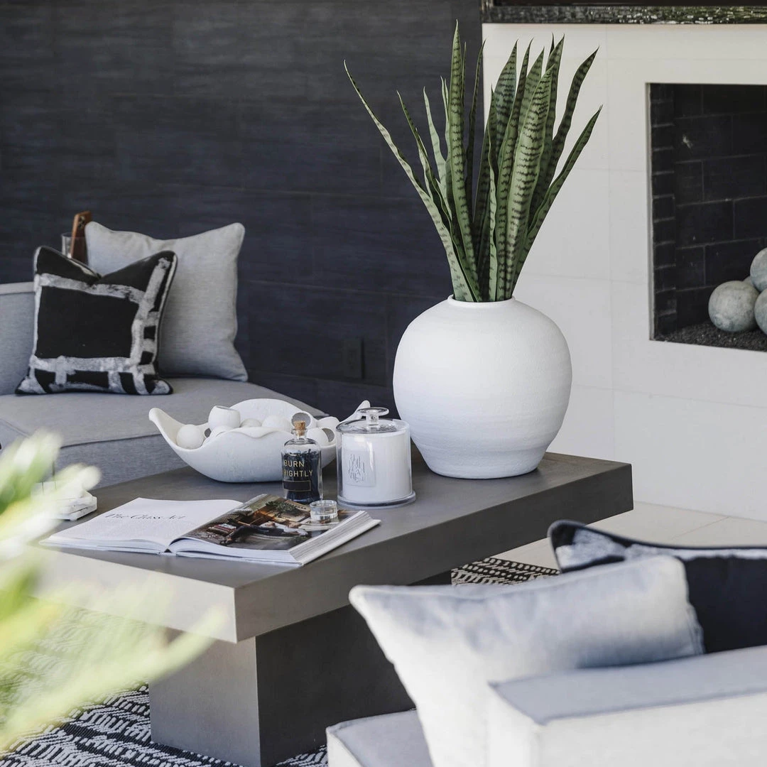 The Mykonos Vase is a round-bellied cement vase in bright textural white. Its size and shape provide a perfect canvas for a large statement arrangement or a simple tropical stem.