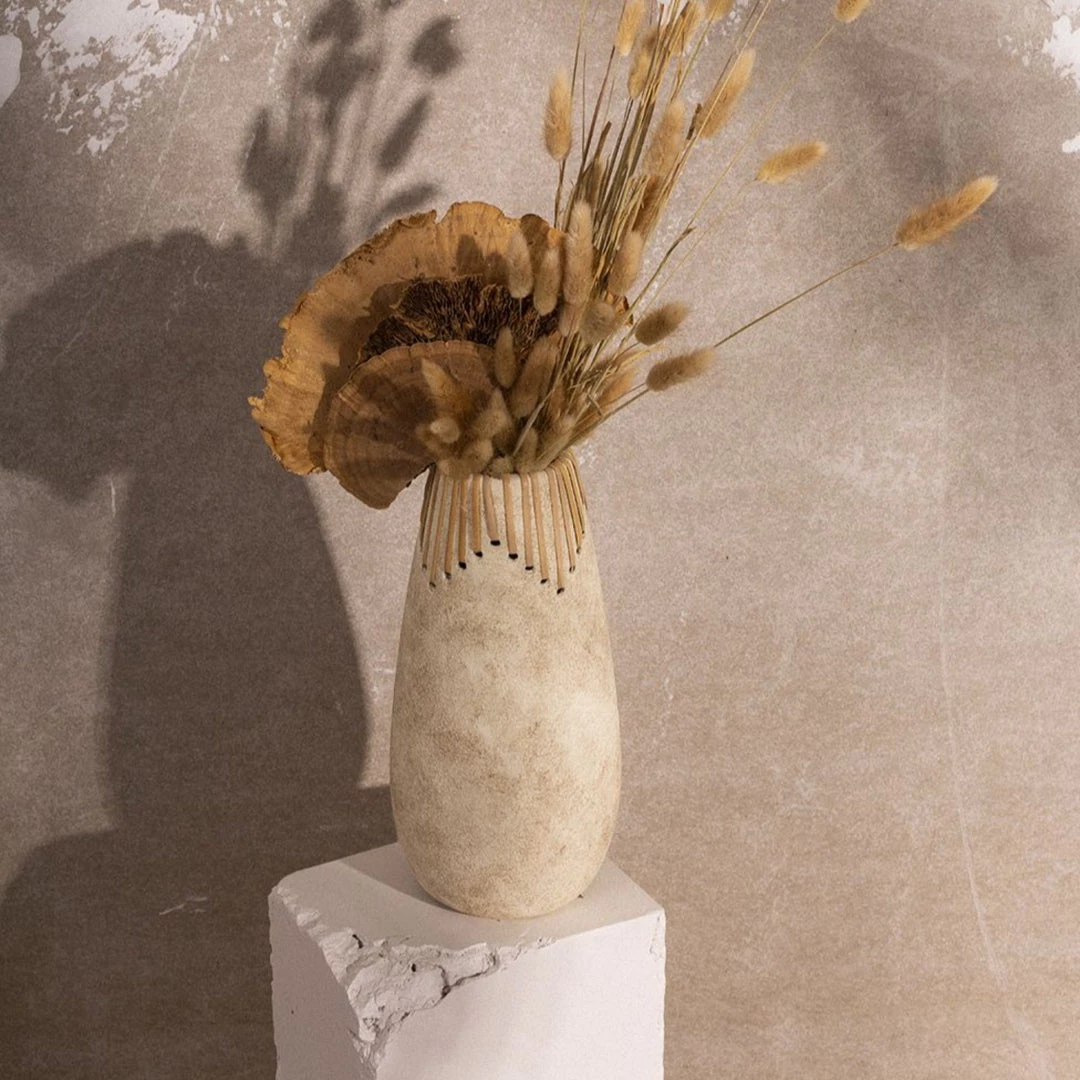 Unique yet classic, the Alaya Vase features a neutral ivory glazed finish, a flared lip, and a natural hand-woven design for added interest and style. The Alaya Vase is a piece of art for your home or garden.