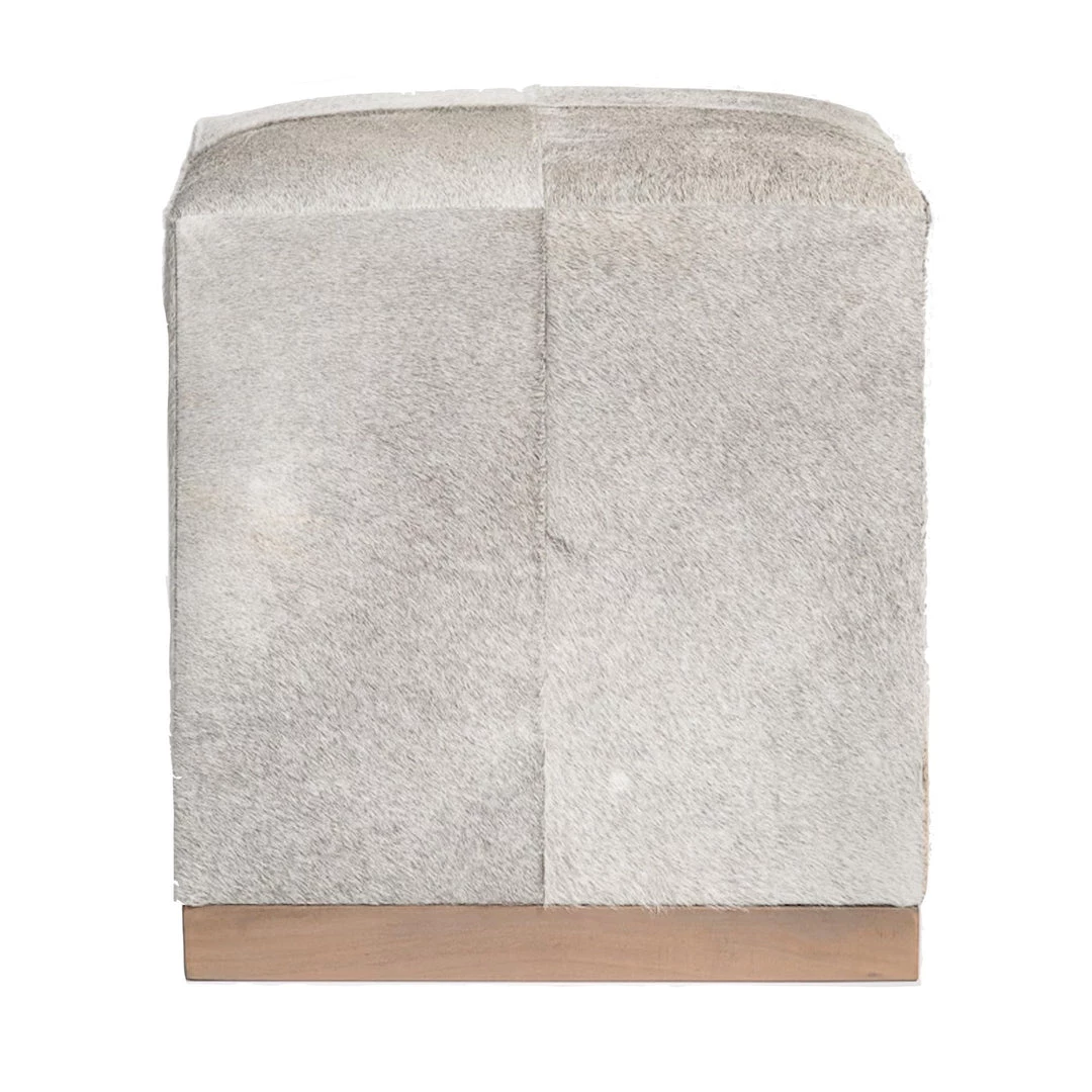 A clean-lined square on a wooden plinth is a showcase for luxe materials and sleek design. Made with hide (note: Hides naturally vary in tone and color since this is a natural product) With a perfectly cushioned top suitable for seating or as a second coffee table surface, it’s an understated complement to any contemporary space.