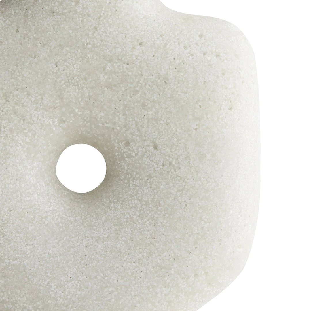 The simple yet complex nature of sculptural art takes shape in this expressive form. Crafted from rice stone this stacked structure features a profile that recalls mid-century design. The sculpture is fitted on a sleek iron base that has been finished in antique brass for an additional touch of elegance. A great museum-quality piece for adding height while delivering an element of intrigue to a tabletop. The finish will vary.