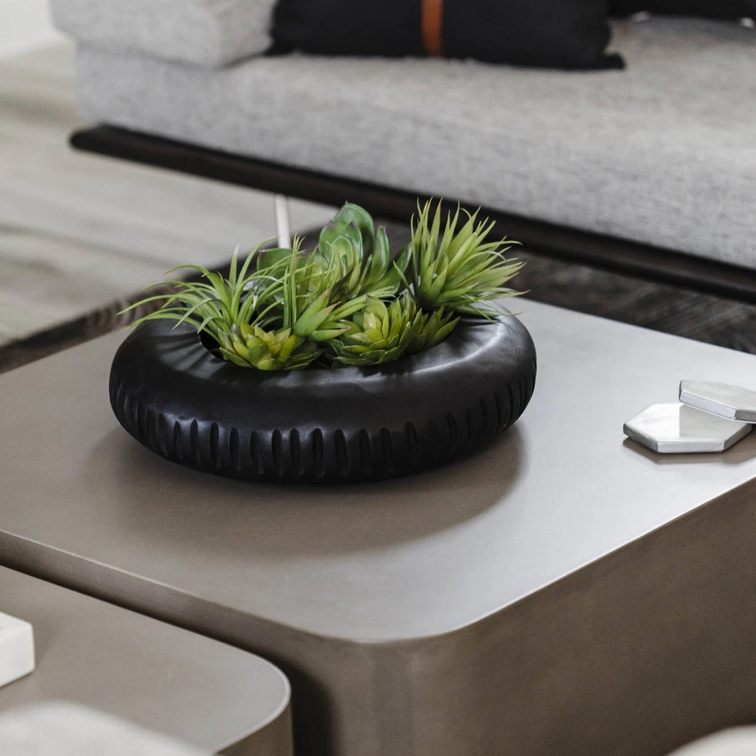 Natural teak root is unearthed to create this unique centerpiece inspired by bowls found in Indonesia. Proudly showcased on a matching teak platform a disk-like surface is accented with hand-carved details that deliver a textural quality to its rich ebony finish. Natural grains trace the surface intensifying its striking aesthetic. Great for adding a touch of drama to a tabletop. Finish and shape may vary.