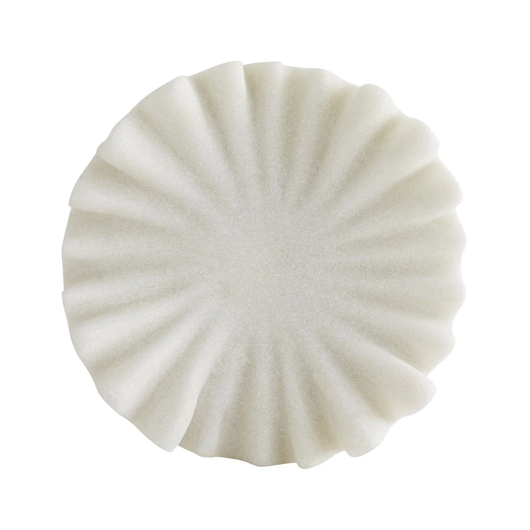 There is some debate as to whether this centerpiece was inspired by the ruffles that denote an Elizabethan collar or the tentacles that waver from a sea anemone but we’ll let you decide. It is crafted from white rice stone and features a rippled façade that extends from a smooth center. A great way to spotlight a few of your favorite curios on a tabletop. The finish will vary.