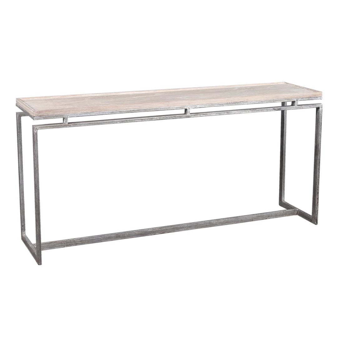 Made of mindi wood veneer. Lime wash finish top and silver leaf iron base.