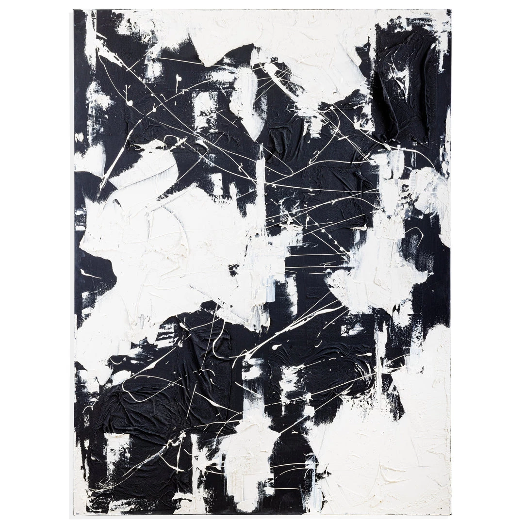 * Note: This piece is a variation of the Mixed Media – Black + White that differs with additional paint splatters on the canvas.