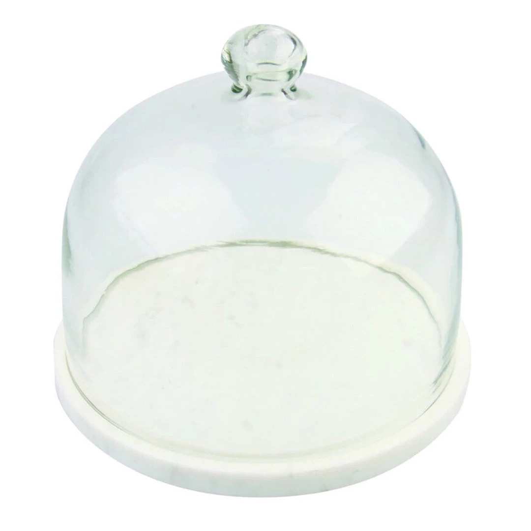 White marble bottom and glass cloche. Hand wash with mild soap.