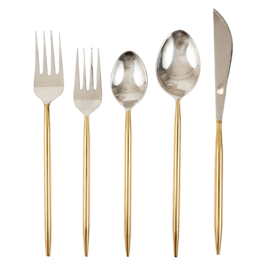 Set of 5, Stainless Gold Flatware. Hand wash only with mild soap.