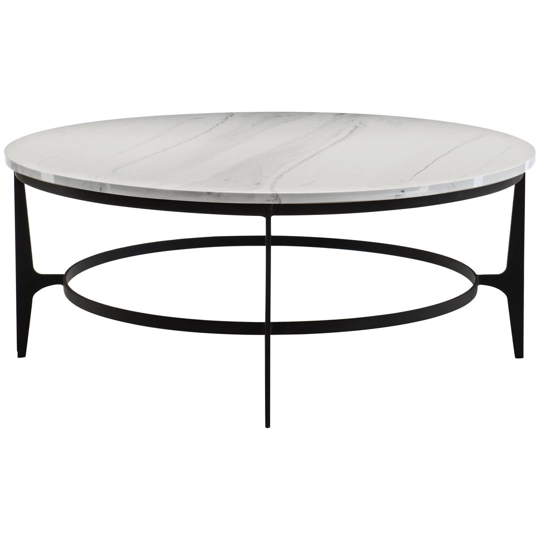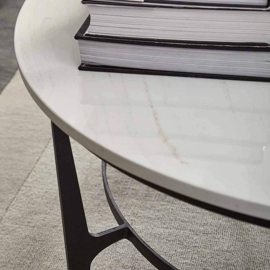 Faux marble top with adjustable glides. Solid steel base and stretcher in blackened finish.
