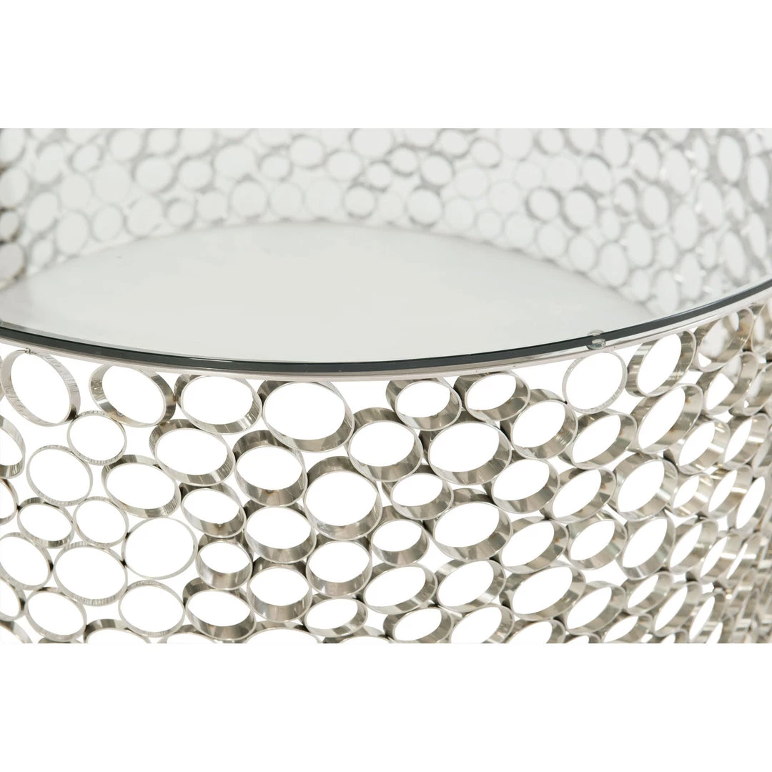 Lay-on tempered glass top, polished stainless steel base with open design, adjustable glides and glass bumper included.