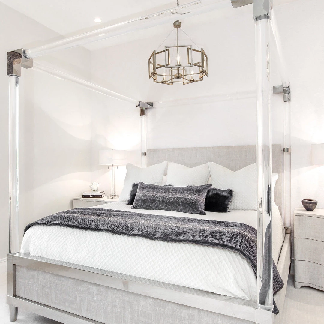 Polished Stainless steel finish as shown, upholstered headboard panel with black denim covered back, upholstered footboard panel and upholstered side rails, metal headboard and footboard frame with feet in polished stainless steel, Acrylic posts and canopy with metal accent connectors in polished stainless steel, three slat support system with adjustable center support and adjustable glides.  Available in King size only.