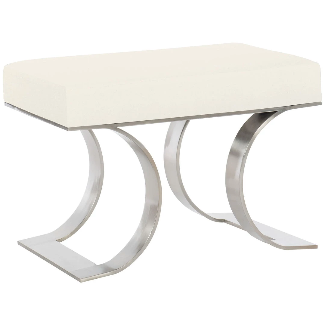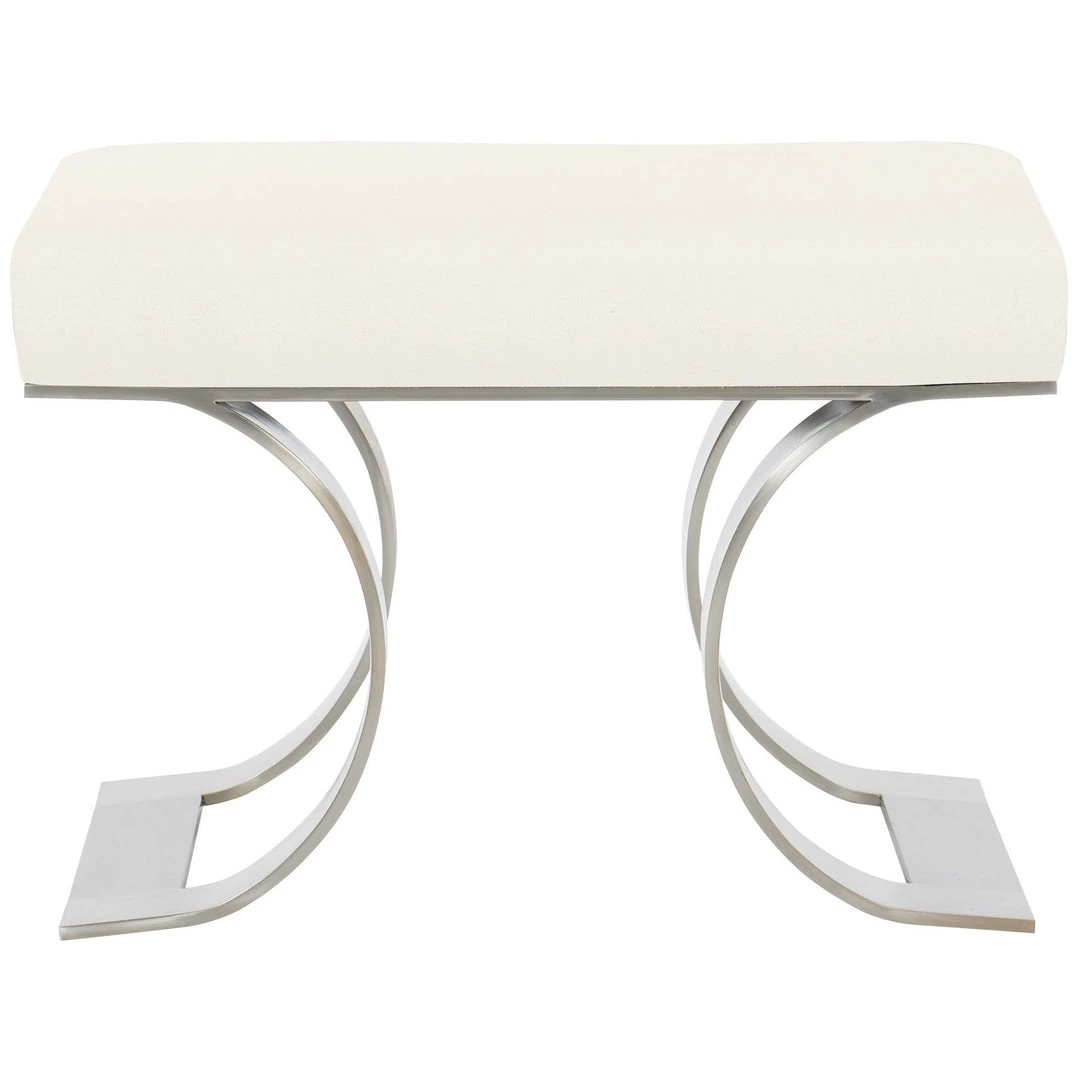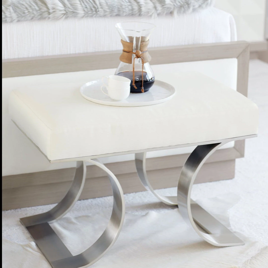 Brushed Silver wood finish, upholstered box seat with top stitching – no welt, solid stainless steel frame with curved, open end panels in brushed Silver finish and adjustable glides.