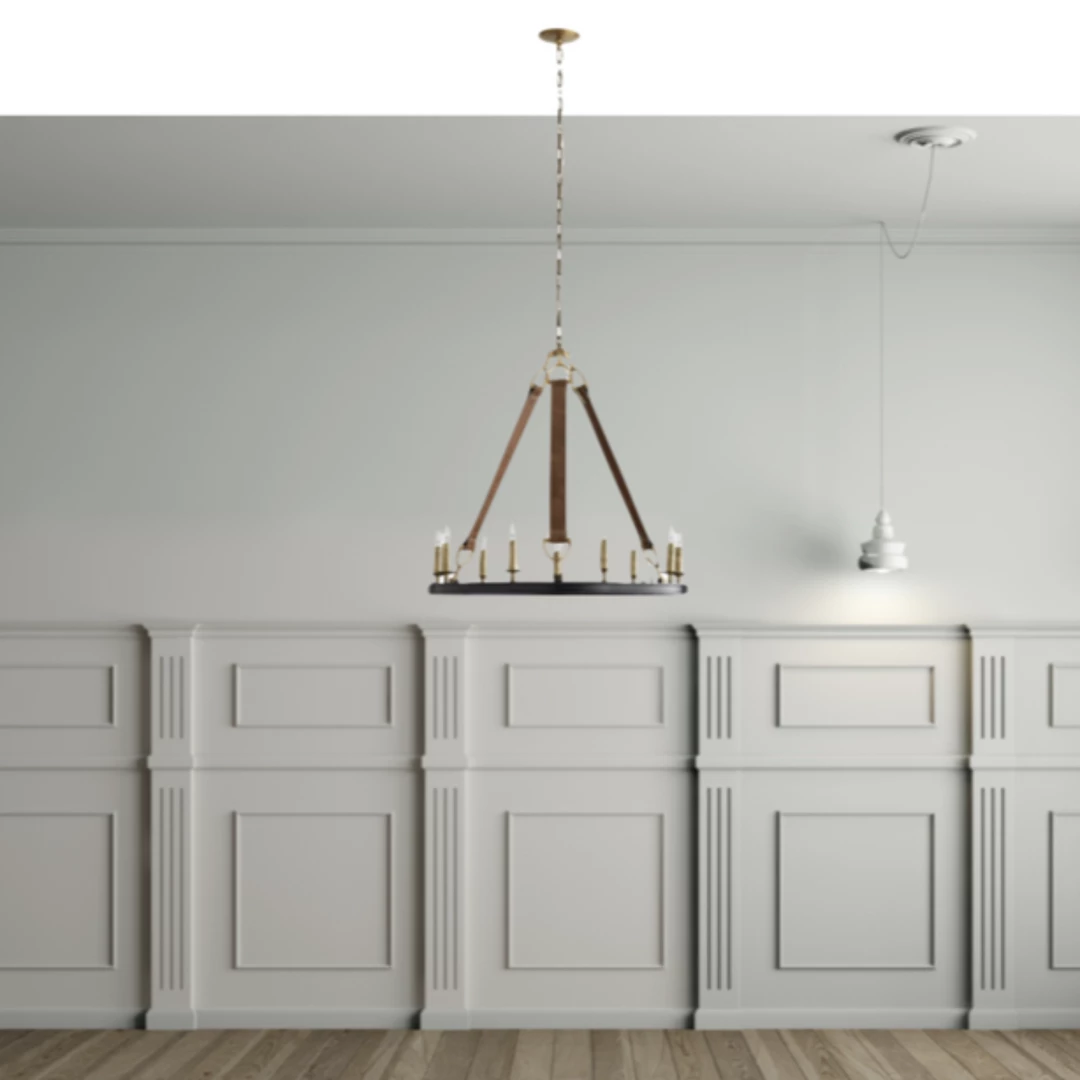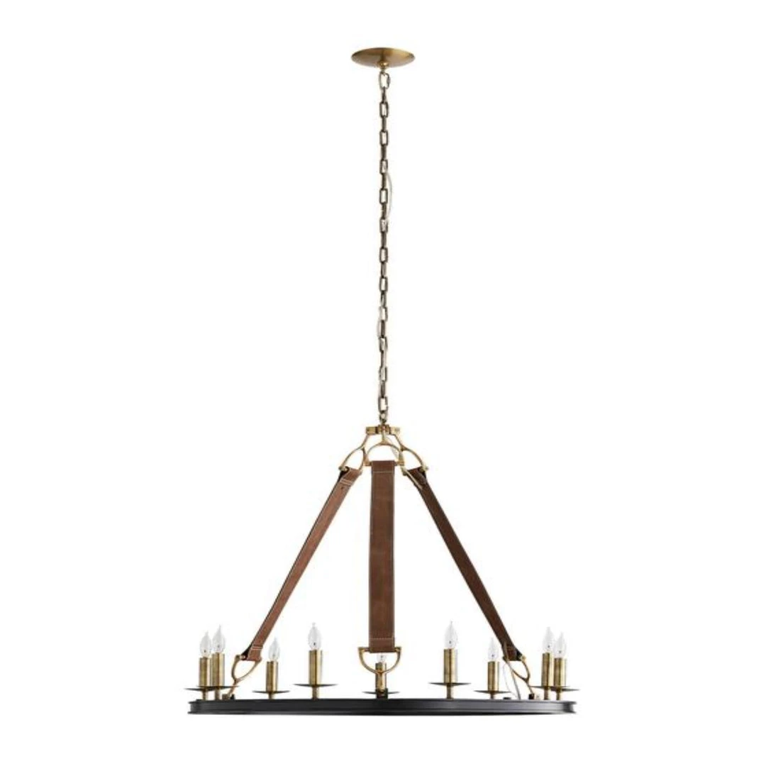 The Chaney saddles up to rustic sophistication with its unique and unparalleled style. Three brown leather bands suspend a hand-hammered iron base adorned with nine candlestick-style arms in a contrasting antique brass finish. Each leather band is accented with an antique brass detail reminiscent of bridle bits delivering an equestrian quality to its industrial form. Shown with clear bent-tip candelabra bulbs. Damp-rated, although limited covered outdoor conditions may affect the finish.