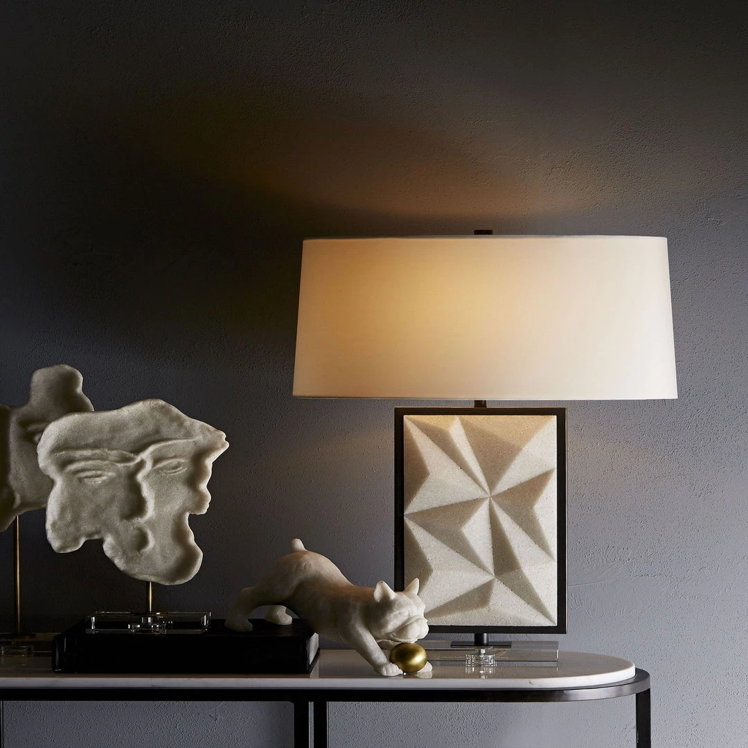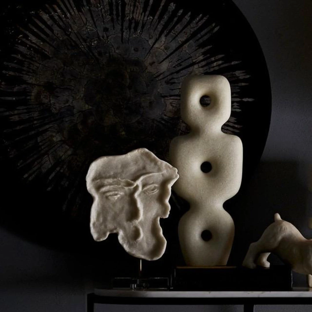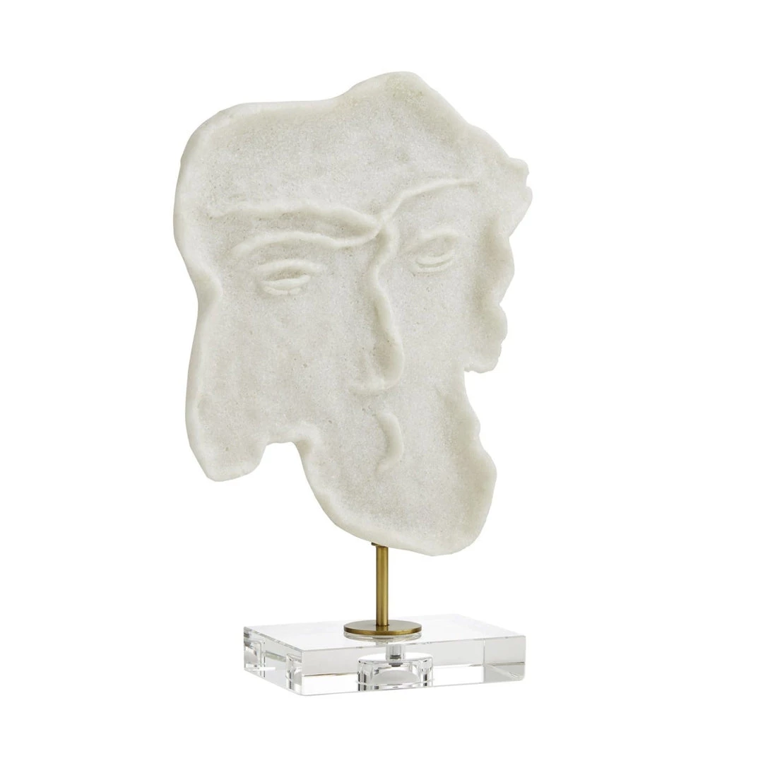 Inspired by the abstract faces that defined Picasso’s artistic career these sculptures are just as artistically daring and defiant. White rice stone is extraordinarily carved leaving the onlooker awe-struck each time they are admired. A thin antique brass pillar extends from a luxe clear crystal base to showcase this striking set. A true work of art for any style space.