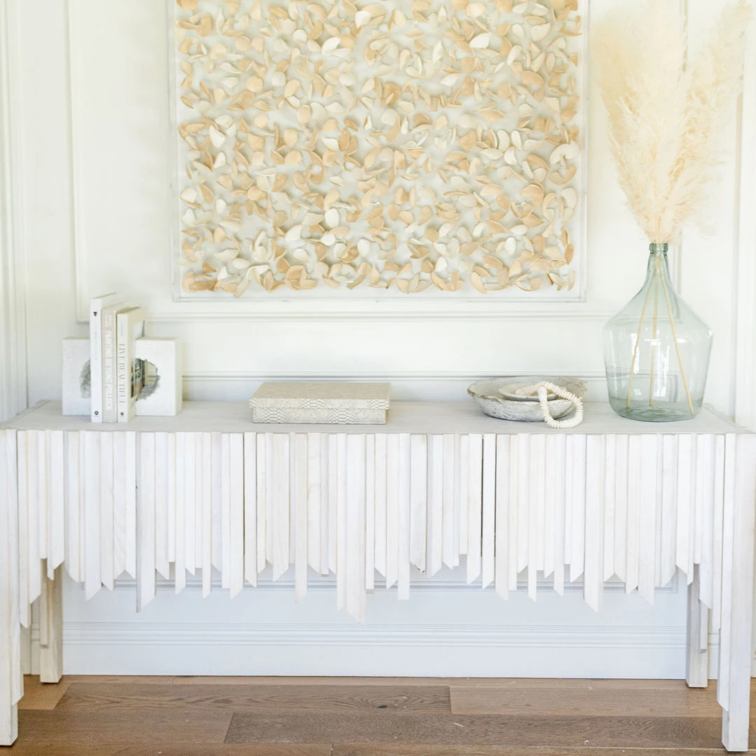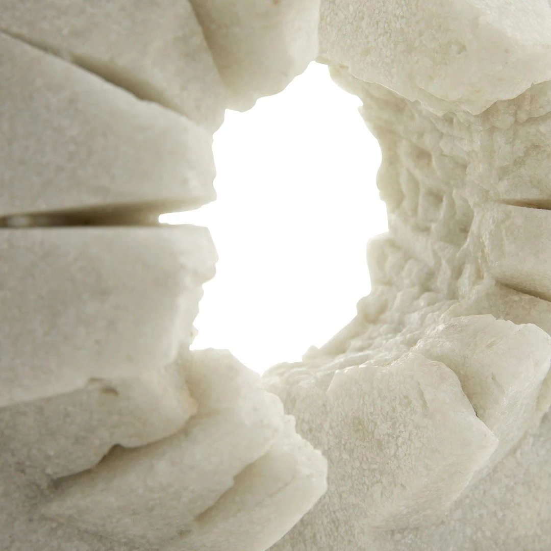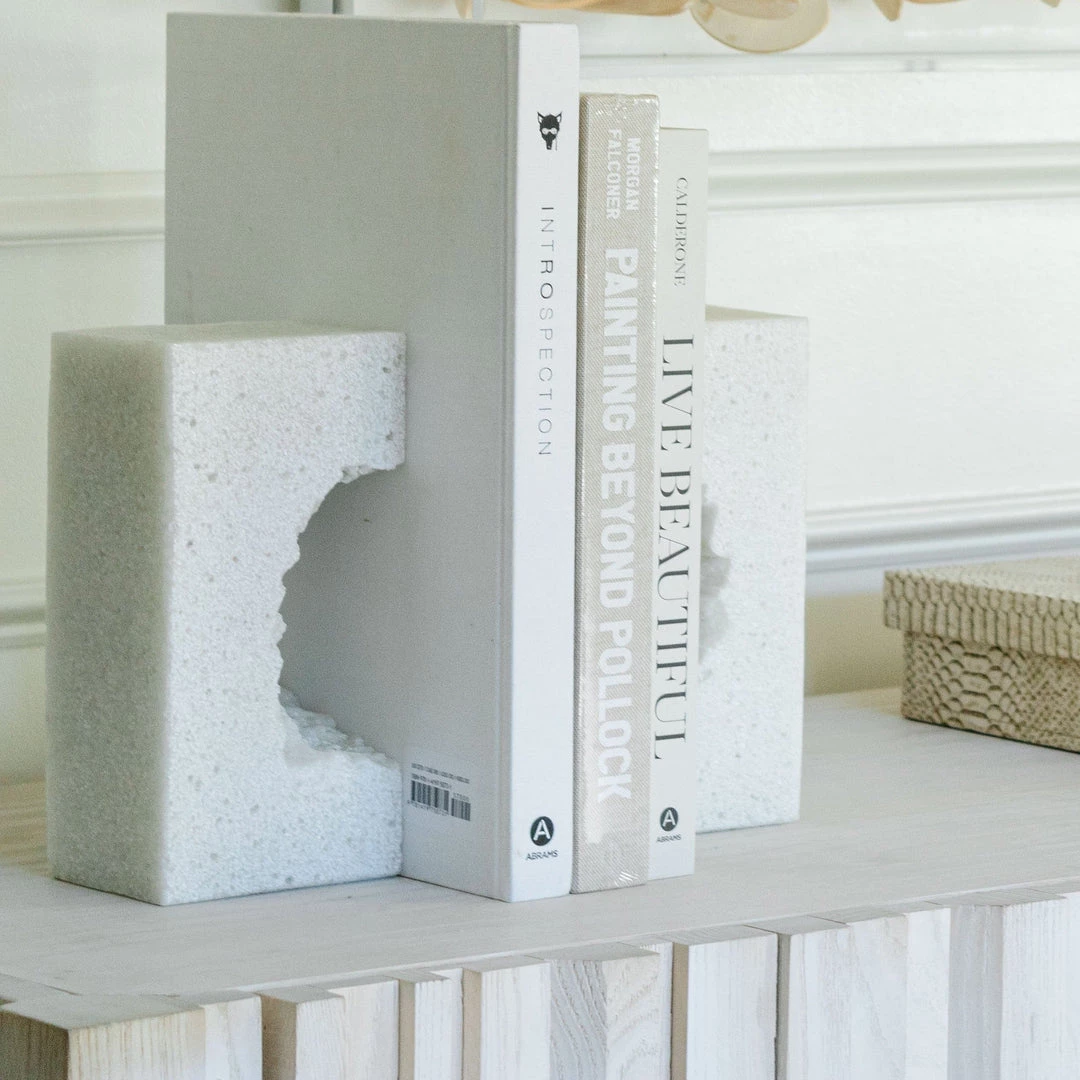 Artistically cast in the rich texture of ivory rice stone, smooth and rough surfaces contrast to provide a dramatic sculptural element to a bookcase. Rice stone will vary.