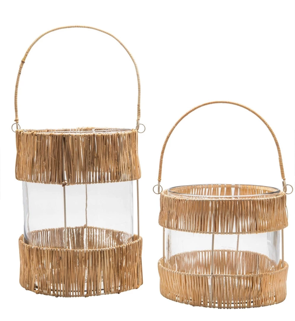 Small clear glass and bamboo hurricane with handle.