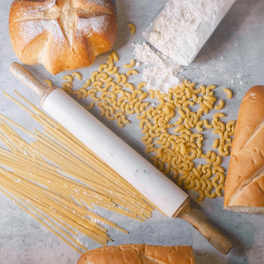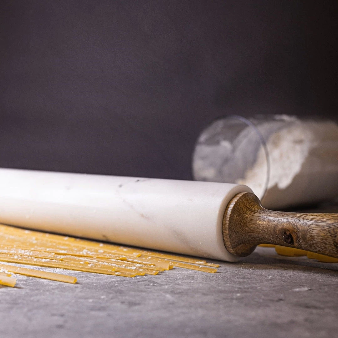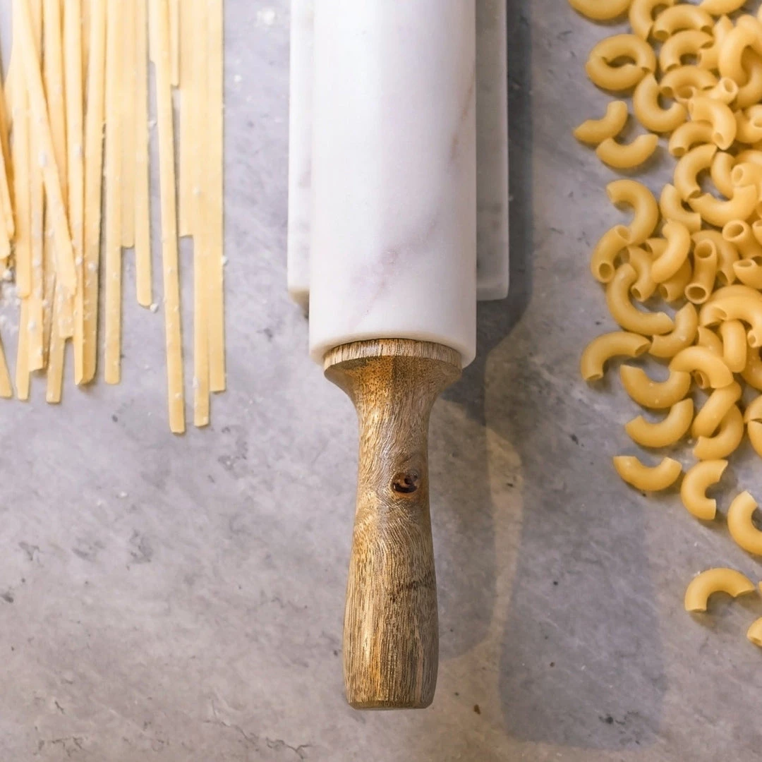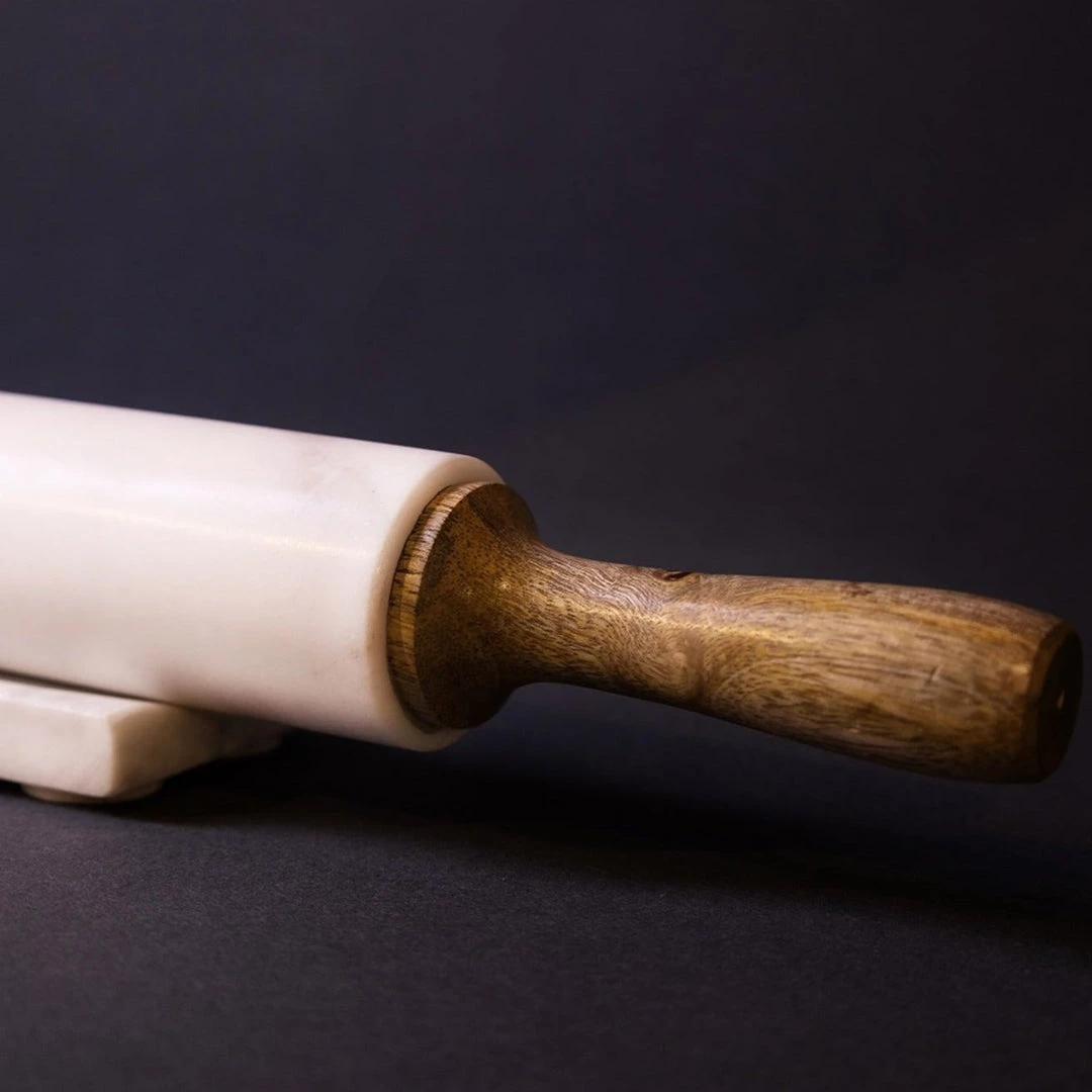 White marble and mango wood rolling pin with base