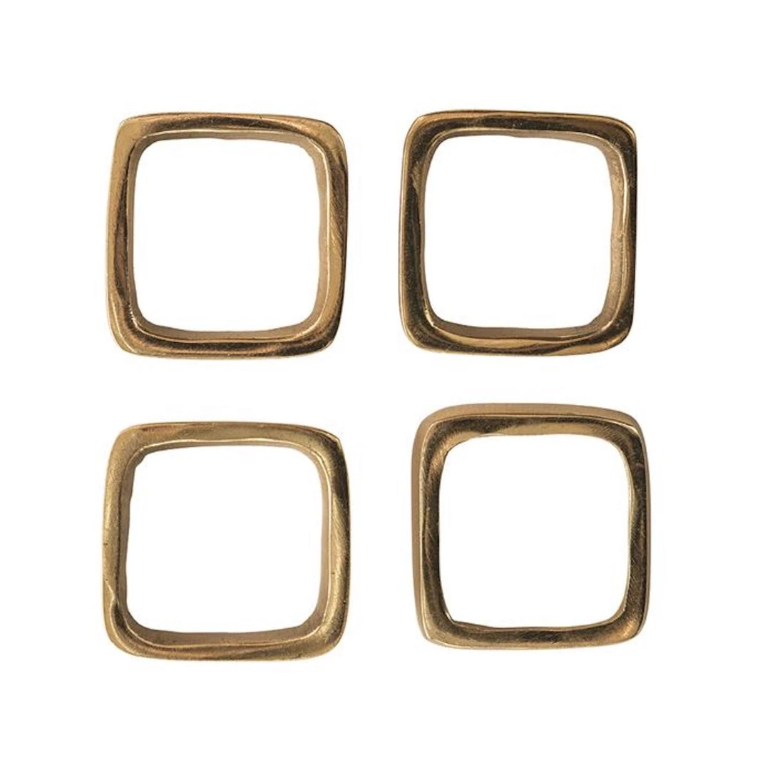 Square Metal Napkin Rings on Leather Tie, Brass Finish, Set of 4