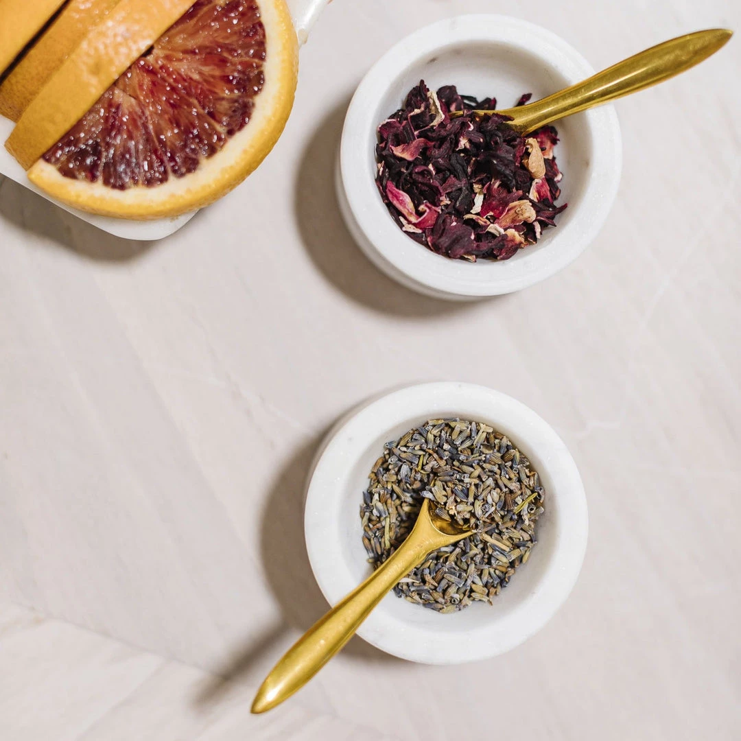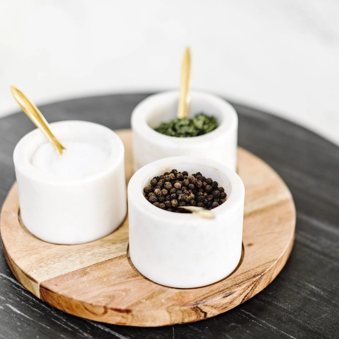 Round Acacia wood board comes in 3 marble pinch pots and brass spoons.