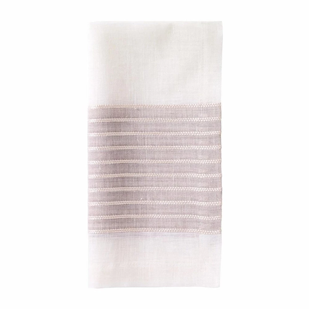 65% Linen, 25% Polyester, 5% Wool, 5% Acrylic. Linen-blend fabric woven with metallic Stripes. Care: Machine wash cold delicate cycle; Line dry or Air fluff; Do not bleach; Iron if needed