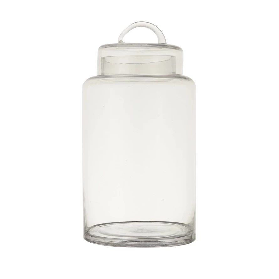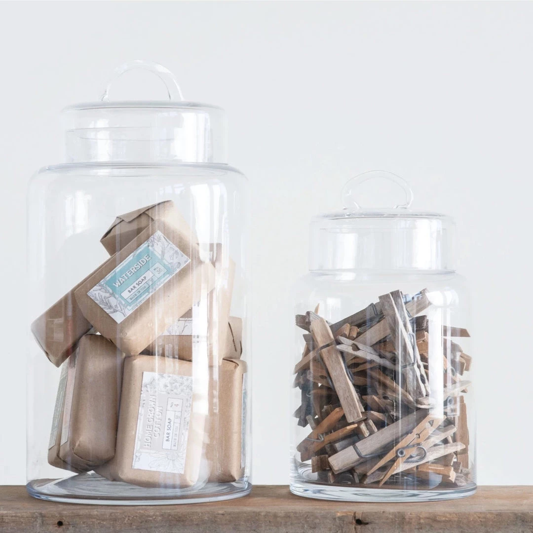 A clear glass container is the “all-purpose” perfect piece. Add a lid and it can be used in any room for anything. Use it for organizing items and being able to see what is inside. Fill with decorative items like greenery, marbles or sand. Keep a small figurine or medal from dust by placing inside and covering with the lid. There is no end to the possibilities a clear container can provide. Each one will vary.