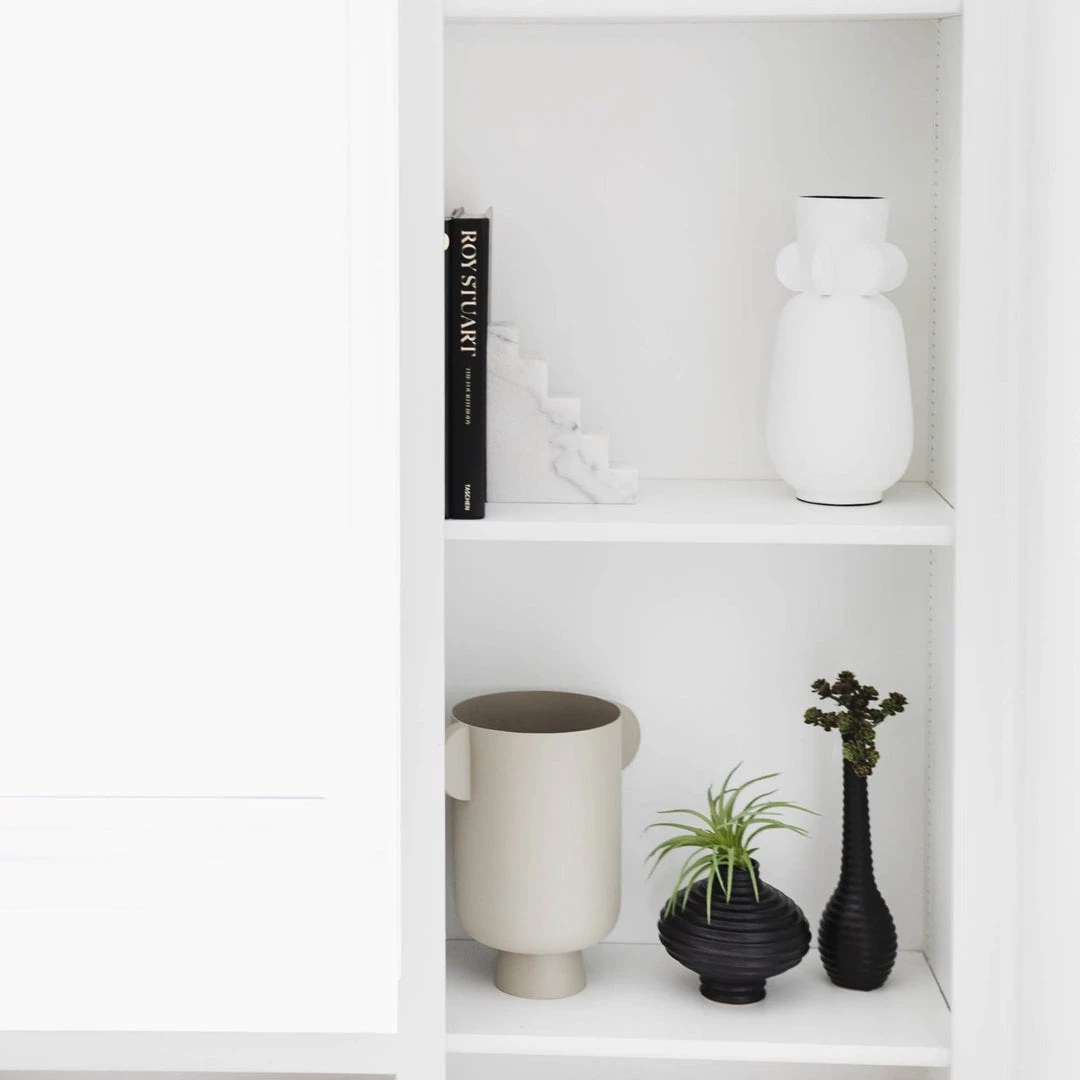 The Baylor Vase is a textured white ceramic vase with a felt bottom and a black finish found inside. At the top of the vase you will find half circle or curved shapes surrounding the outside to give off a trendy look.Â
