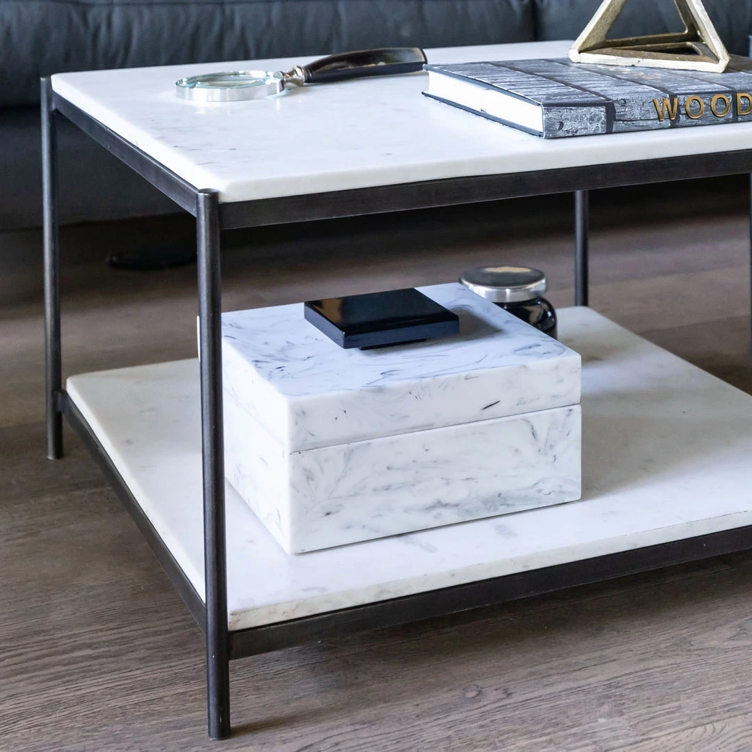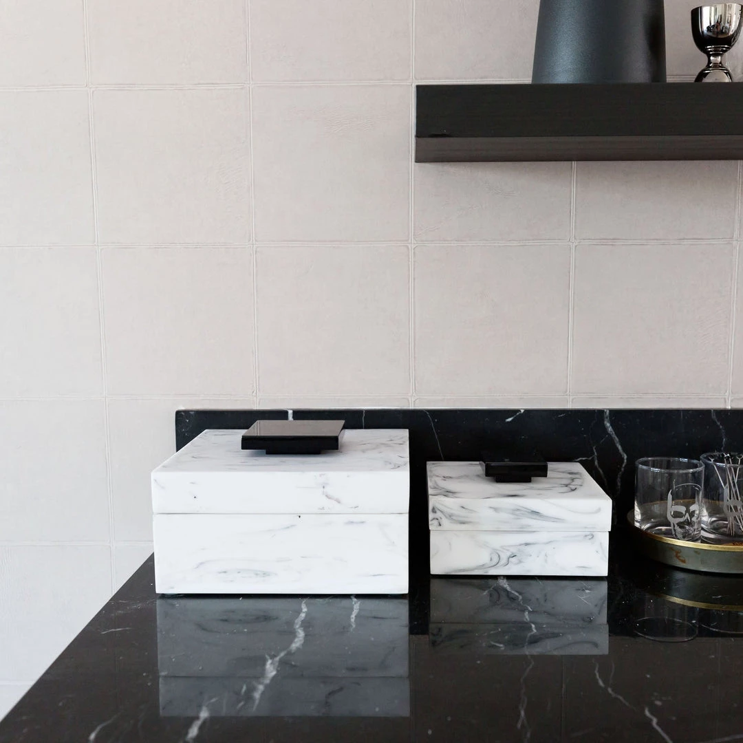 Faux White Marble/Glossy Black finish, composite material and available in small and large.