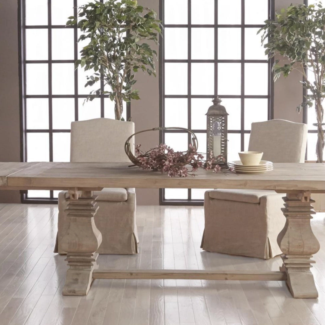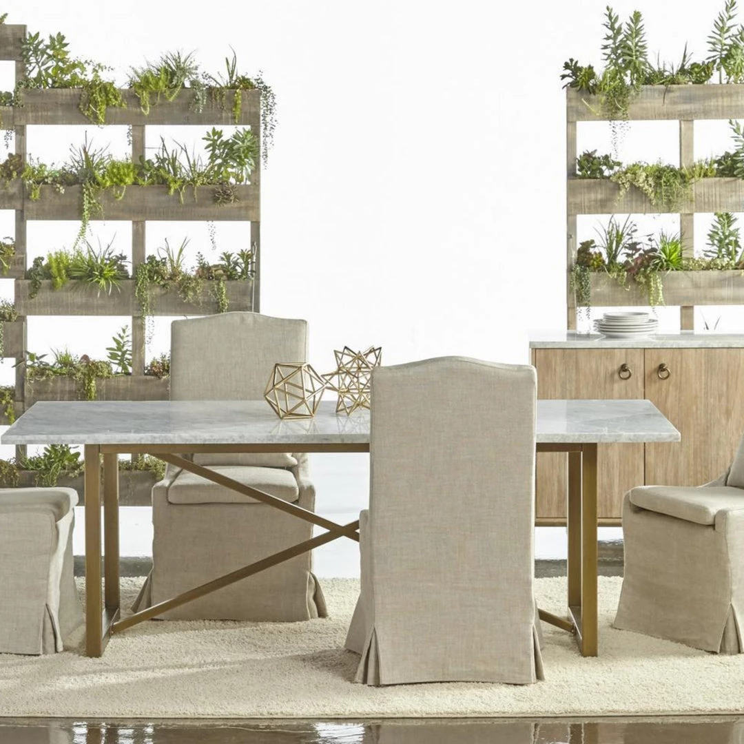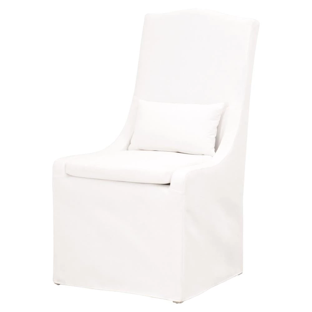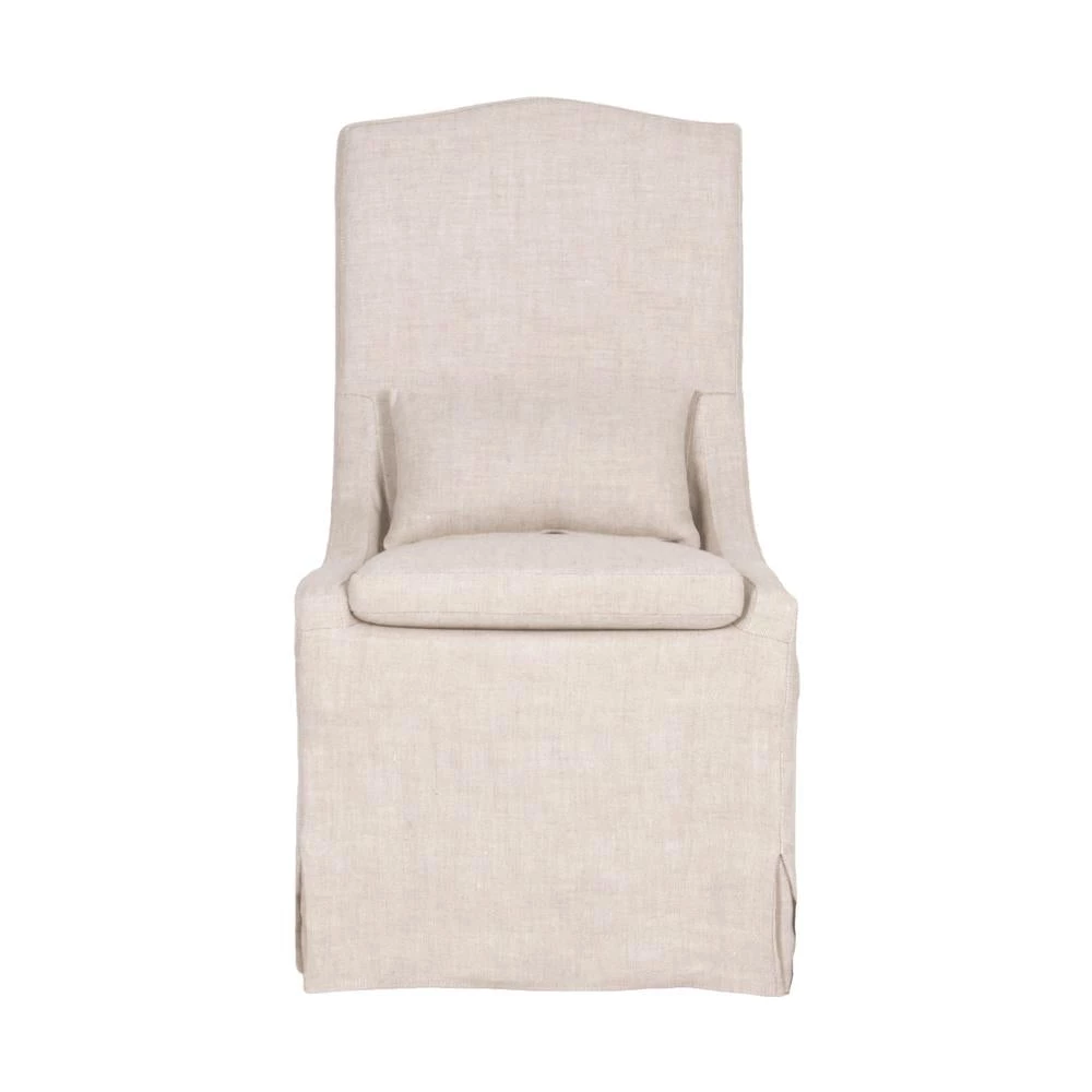 Add a touch of class and sophistication to your kitchen or dining space with these upholstered dining chairs. The side chairs feature a removable slip cover made with a beautiful French linen in a creamy bisque color. This slip cover design compliments the scalloped seat back, giving them a classic look that would work well in either formal or informal dining spaces. Paired with a removable seat cushion and lumbar pillow, the chairs provide comfort with style and will be the perfect addition to any transitional or traditional dining room.