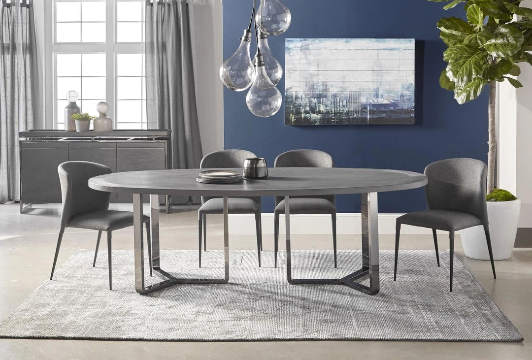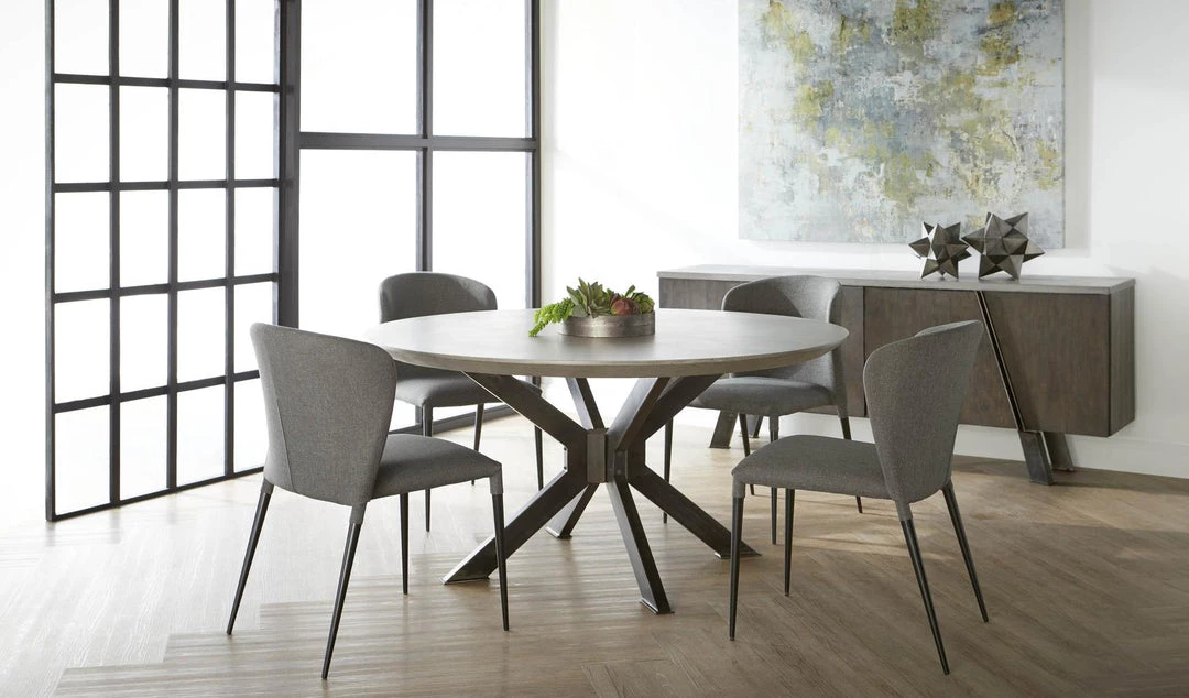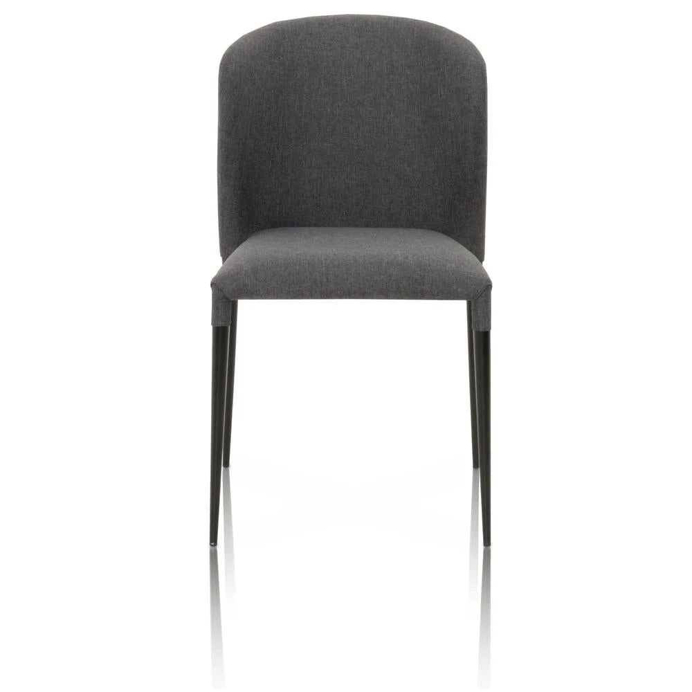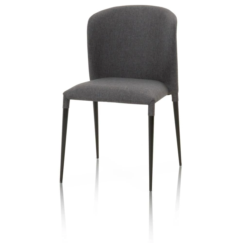 These lightweight dining chairs are both easy to maneuver and versatile. Their sleek silhouette is complimented by an eye-catching curved seat back, adding comfort and style to these chairs. They are upholstered with a rich denim-like gray polyester fabric and have thin, matte black metal legs. Their slim legs and darker color tones match well in an industrial, contemporary, or modern dining room or kitchen. These chairs pair nicely with many dining tables, including but not limited to glass, metal and concrete topped tables.