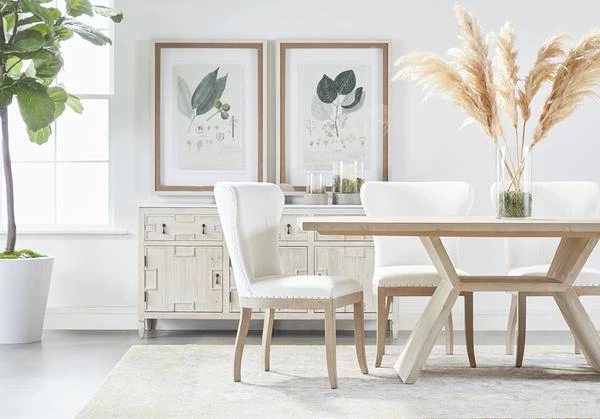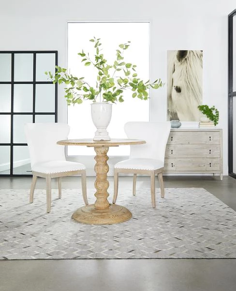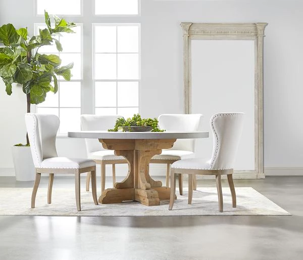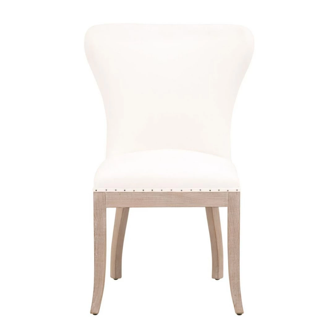 These classic white dining chairs perfectly pair farmhouse and traditional styles. The curvature of their wingback construction allows for comfort and eye-catching design. The back of the seat and seat cushion are lined with black nail tacks, adding just a touch of farmhouse feel. They are upholstered with a high-performance fabric that is stain resistant and makes cleaning easier. A solid ash wood base with natural gray tones gives the chairs support and durability for many uses around your dining area. Add these chairs to your dining room or kitchen for a classy and clean style.