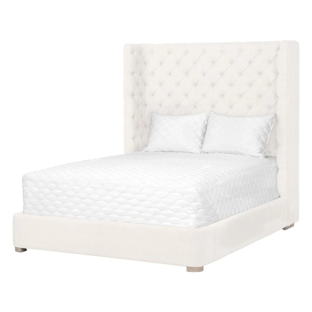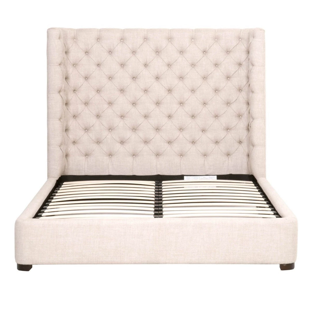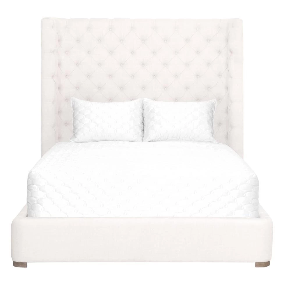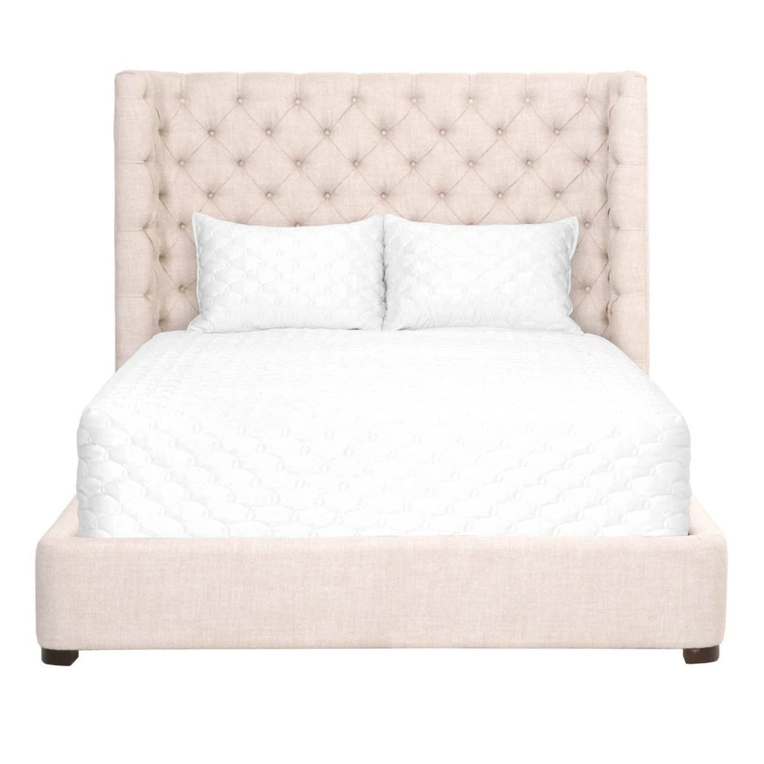 Transitional style bed featuring tufted headboard and 100% linen upholstery.
