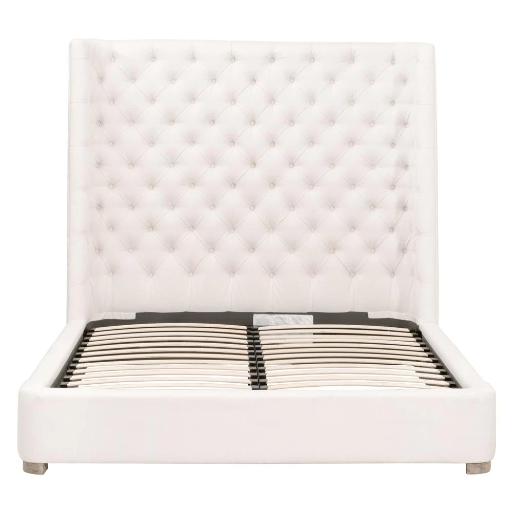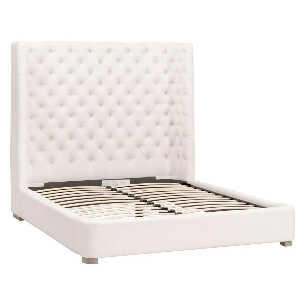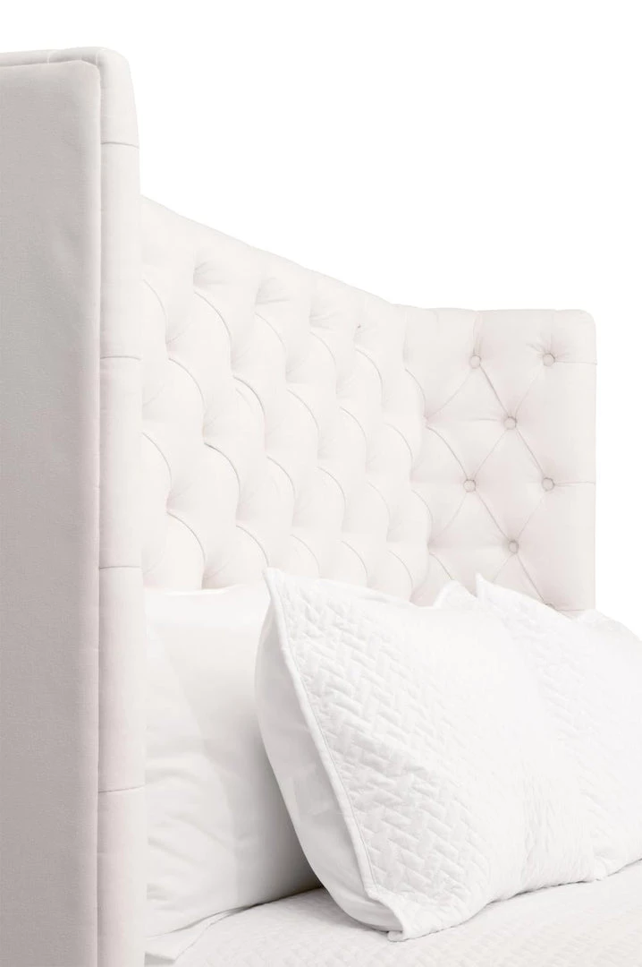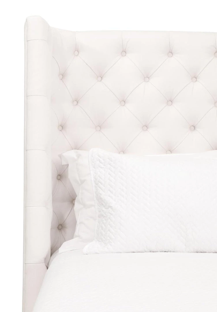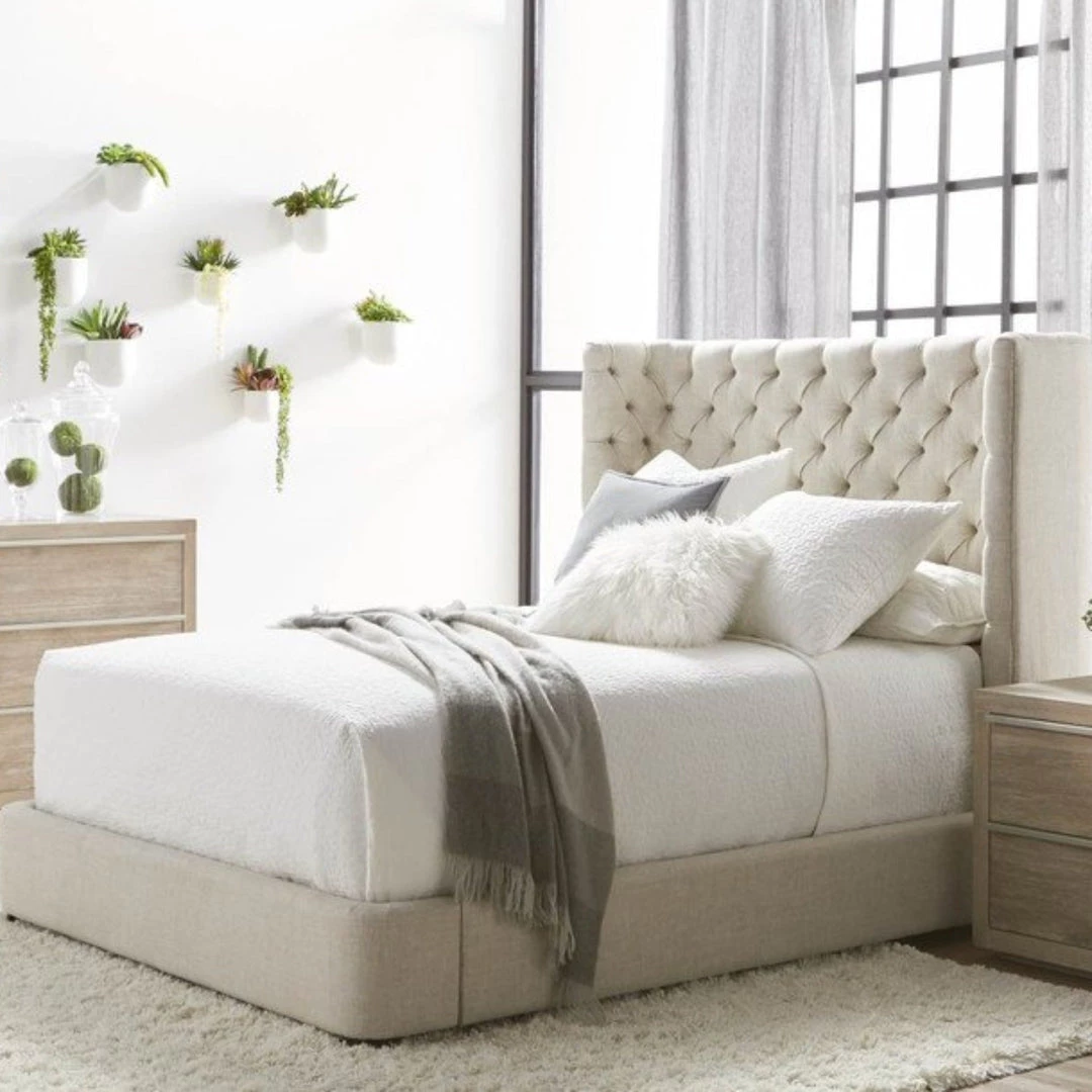 Transitional style bed featuring tufted headboard and 100% linen upholstery.