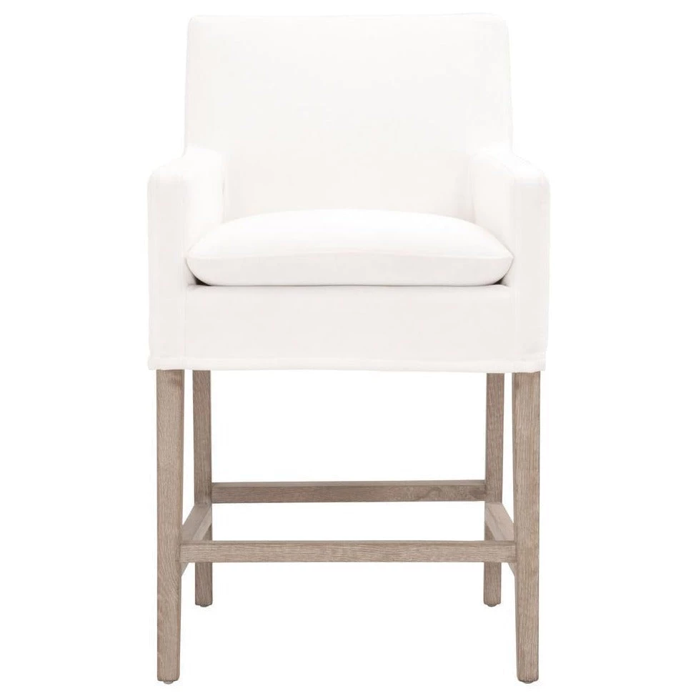 The simple and elegant look of this counter stool makes it an ideal fit for many settings. The seat cushion has knife edge detailing and is both removeable and reversible. The cushion is filled with down and high-density foam that make this stool pleasantly comfortable for sitting. The wood base is constructed with solid oak with natural gray undertones, perfectly complementing the white fabric. The upholstery is made of a high-performance fabric and consists of a removable slipcover for easy and convenient cleaning. Adaptable to many settings, this armchair-styled counter stool can be used in a dining room, kitchen, or bar. Its transitional style, appealing colors, and ultra-cozy seat easily make this stool a great fit for any kitchen or dining room.