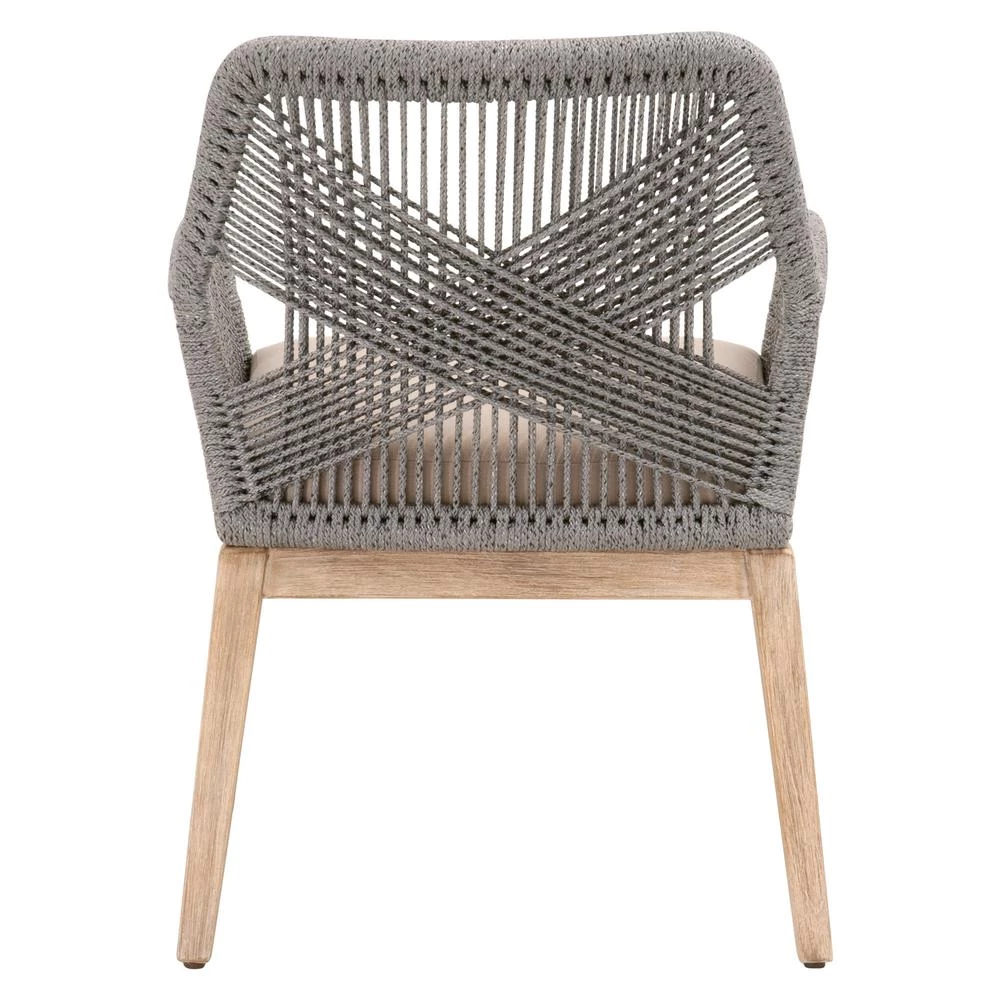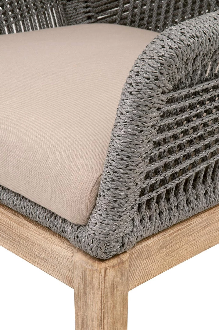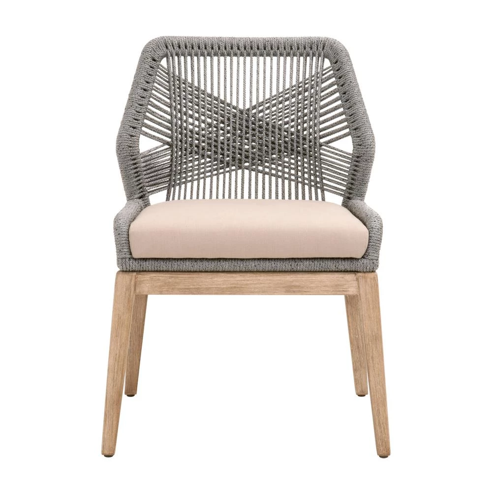 These woven side chairs will add a touch of coastal style to your kitchen or dining space. Constructed with a reinforced aluminum frame and solid mahogany legs, these dining chairs are not only sturdy, but durable. A rich platinum-colored rope is tightly woven to create a unique loom design, while the wood legs have a beautiful distressed natural gray finish. Paired with a fixed light gray seat cushion, the chairs provide comfort with style and will be the perfect addition to any transitional or traditional dining room.