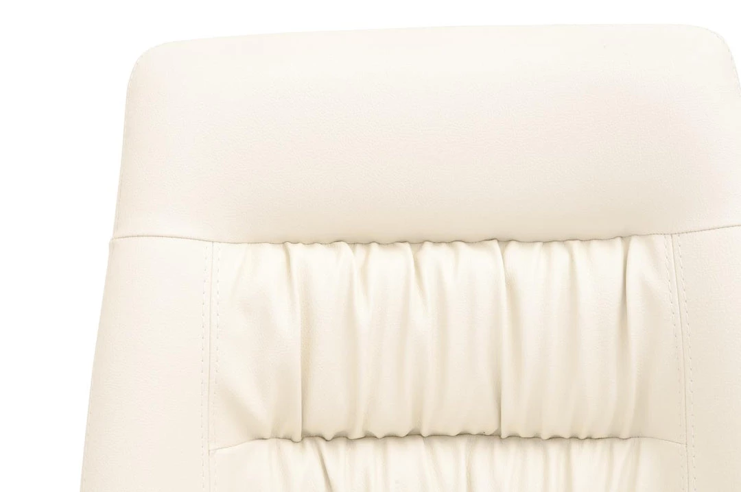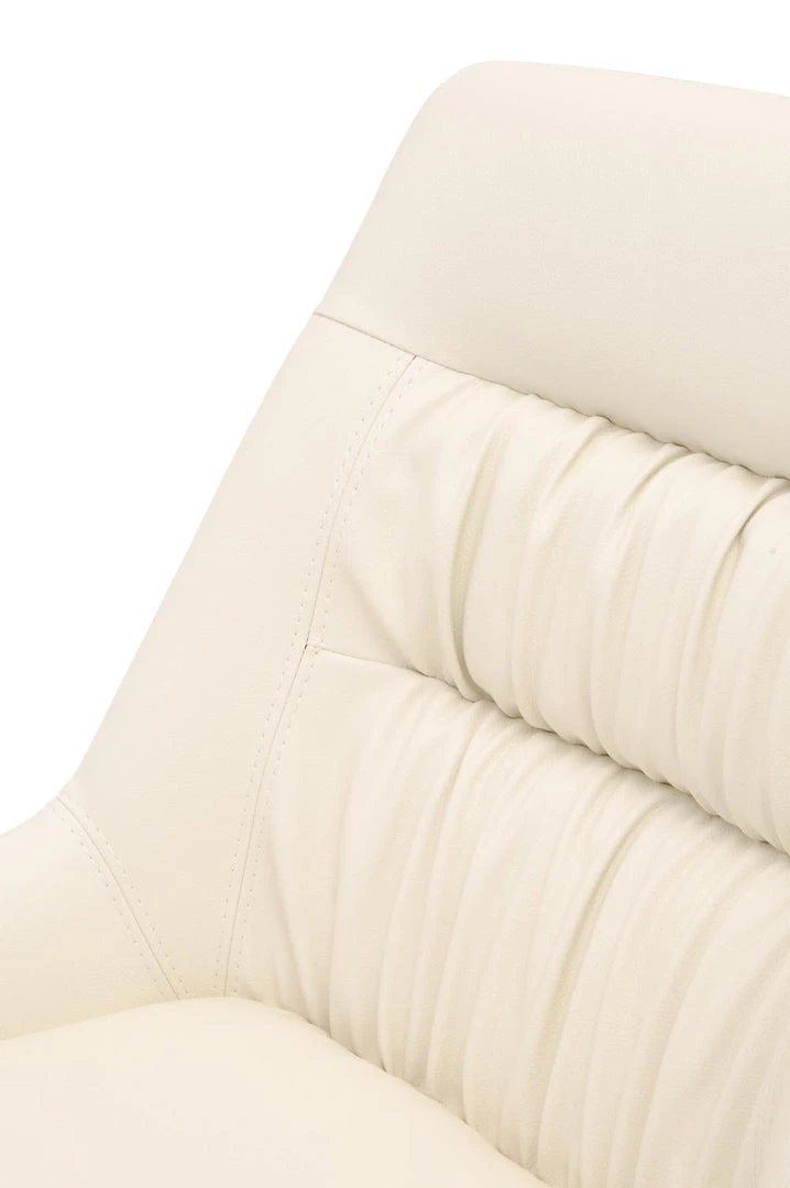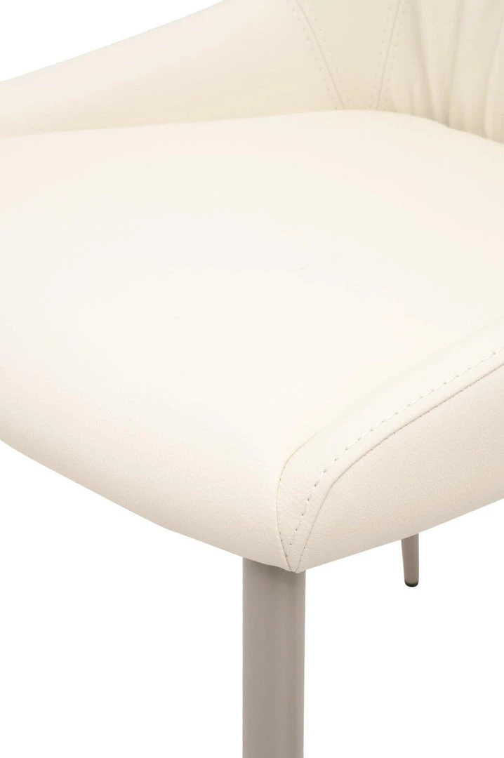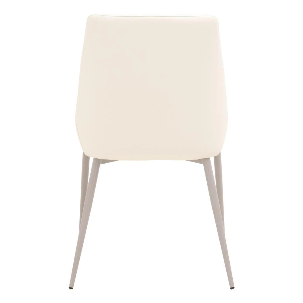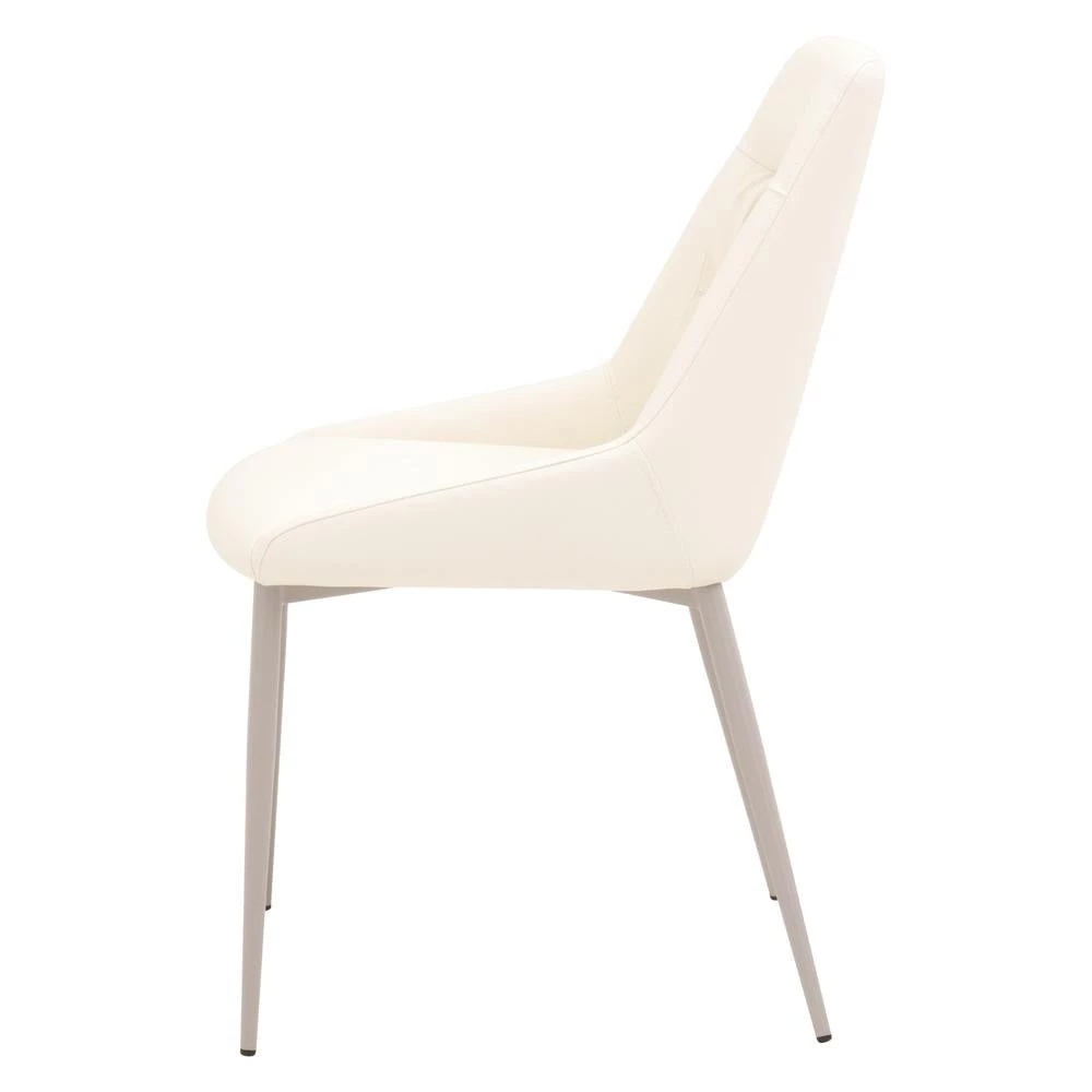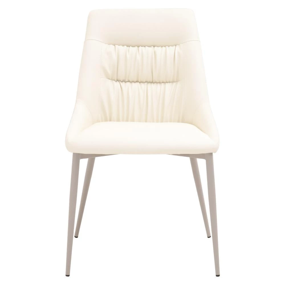 These lightweight dining chairs are both easy to maneuver and versatile. Their sleek silhouette is complimented by an eye-catching seat back with double shirred pleat detailing on the inside backrest. They are upholstered with a rich off-white synthetic leather and have thin, matte light gray metal legs. Their slim legs and light color tones match well in a contemporary or modern dining room or kitchen. These chairs pair nicely with many dining tables, including but not limited to glass, metal and concrete topped tables.