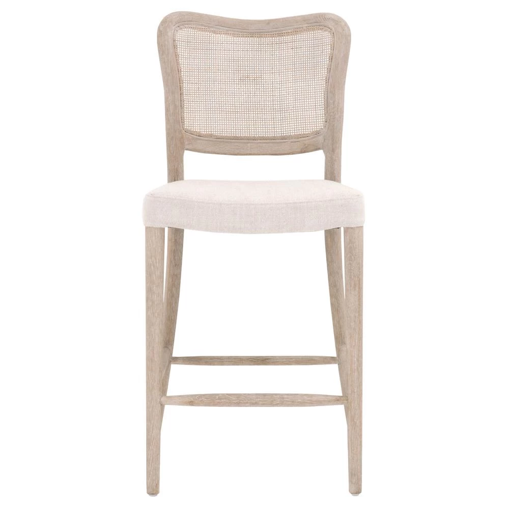 This transitional counter stool has a very soft and natural look that is suitable for many different kitchen and bar styles. The light neutral tones and cane seat back make this stool a perfect fit for transitional, farmhouse and coastal looks. The seat is upholstered with a beautiful bisque colored linen and the chair back is made of a mesh-like cane with wood framing. The solid oak base has a slightly distressed finish that adds a very raw and organic feel to the wood. This counter stool will be the perfect finishing touch to your kitchen or bar area.