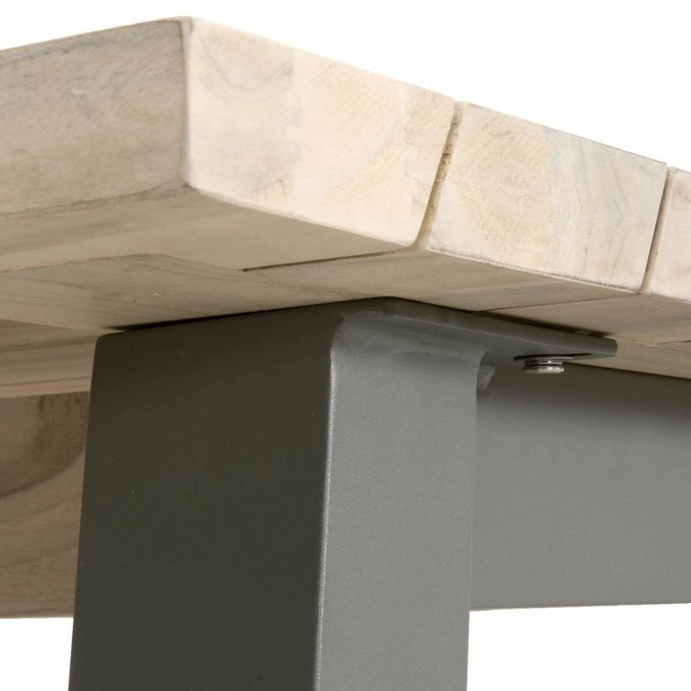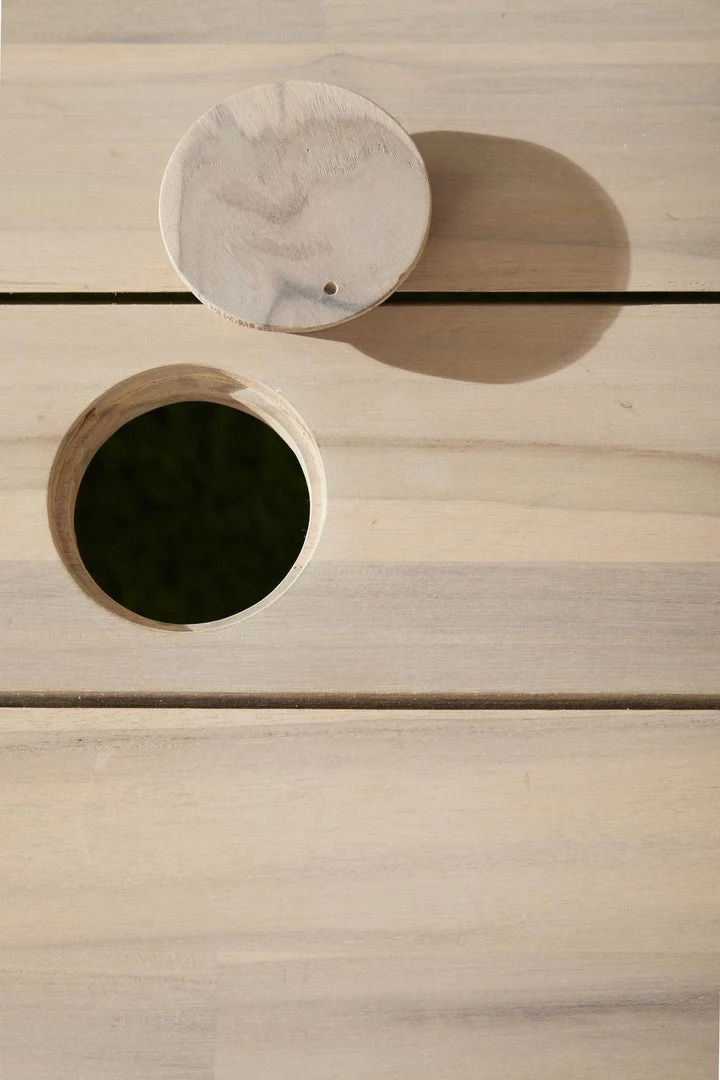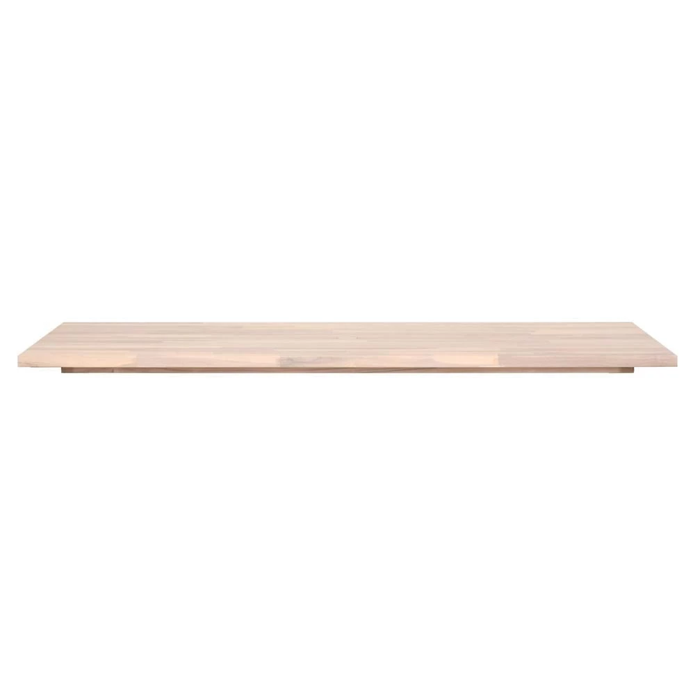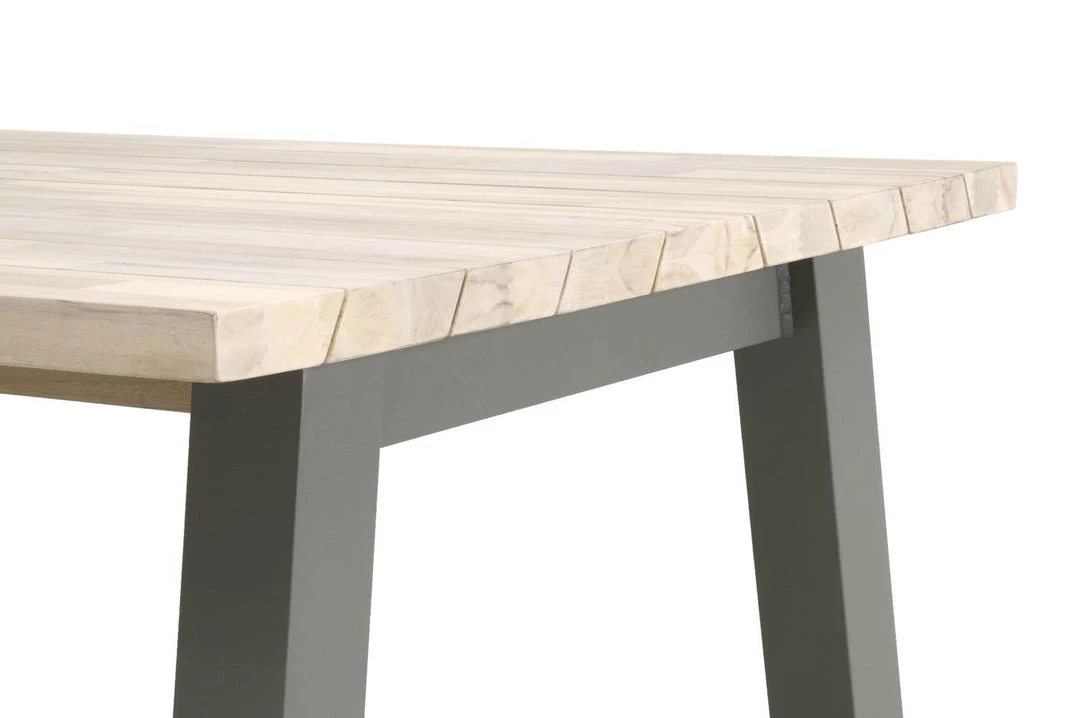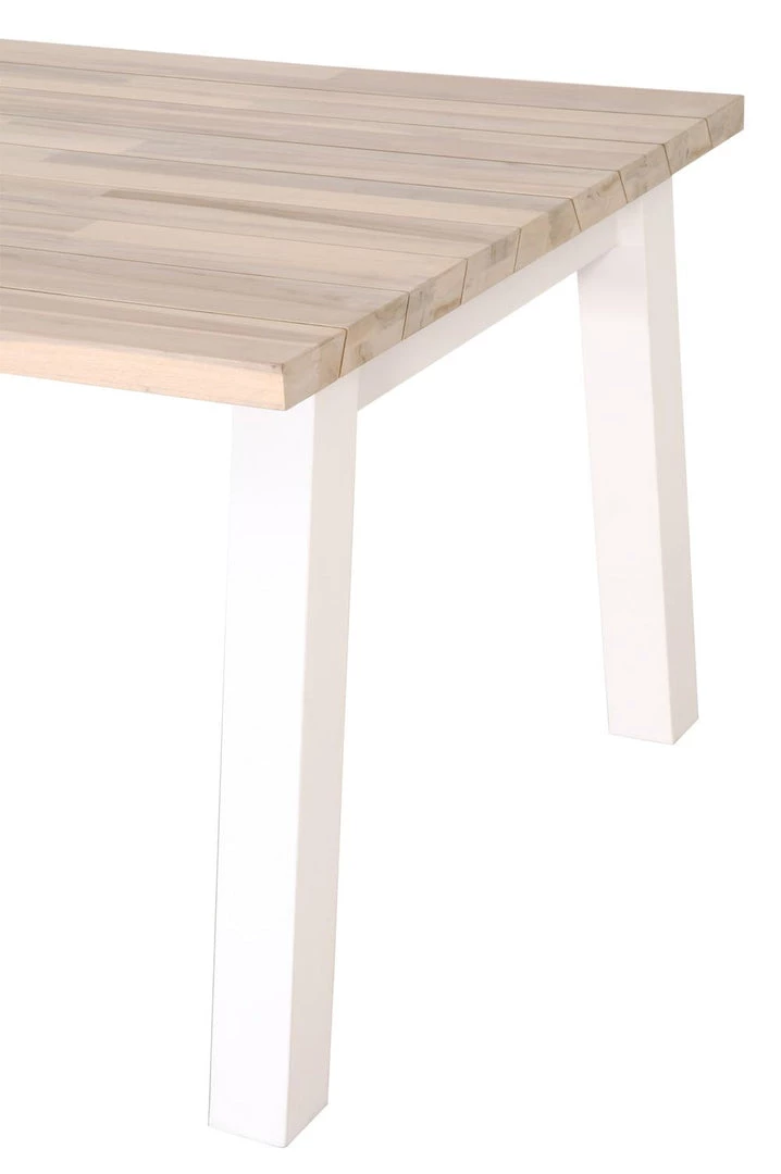 Transitional style dining table top made with solid teak that is suitable for either indoor or outdoor use, and features a removable umbrella hole.
