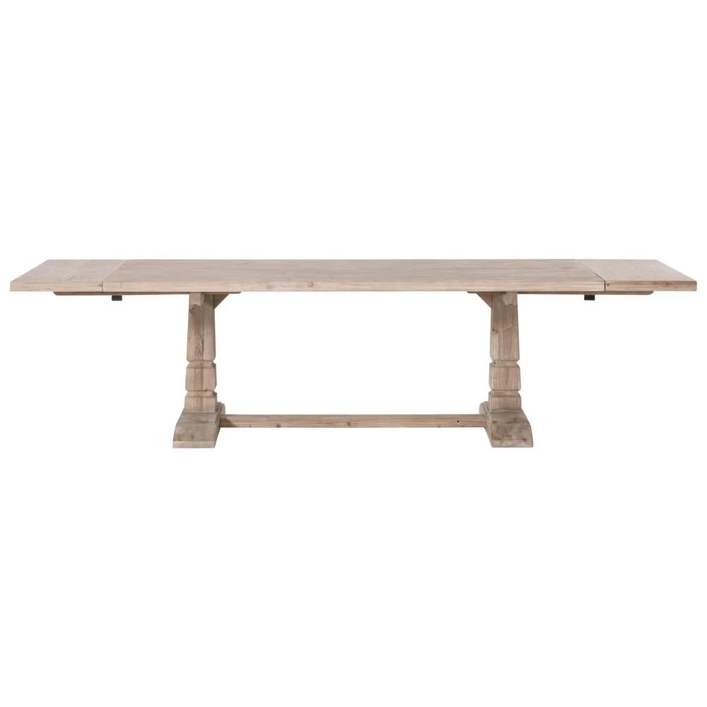 This large extension dining table has a rustic charm that can meld with many interior designs. It is constructed with a reclaimed pine wood, adding character and organic modern style to this table. It contains two removable extension leaves that can be added to the ends of the table when additional seating and space is desired. The trestle-style base adds stability and decorative design for an eye-catching component. Can comfortably seat up to 10 people.