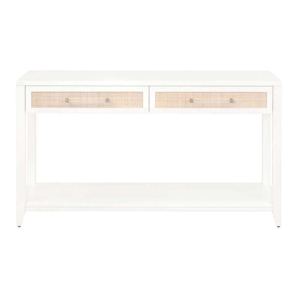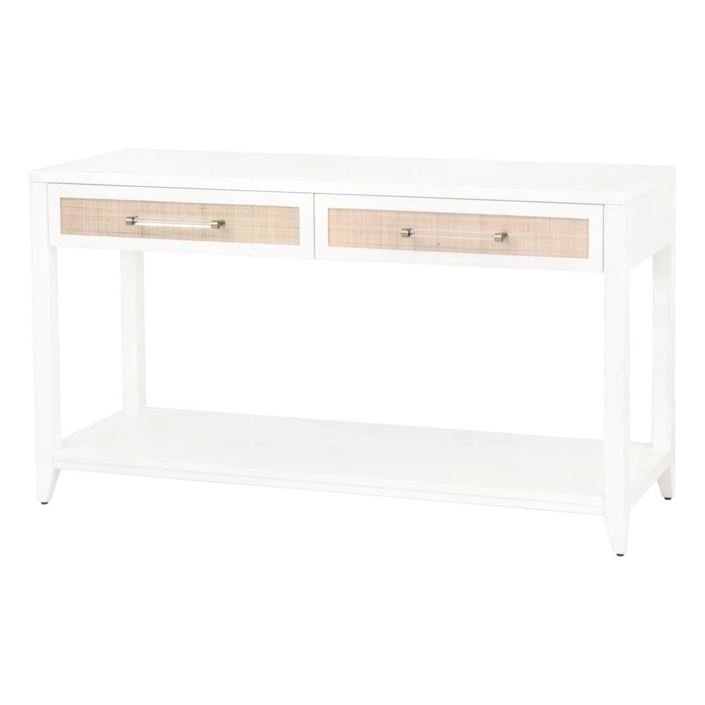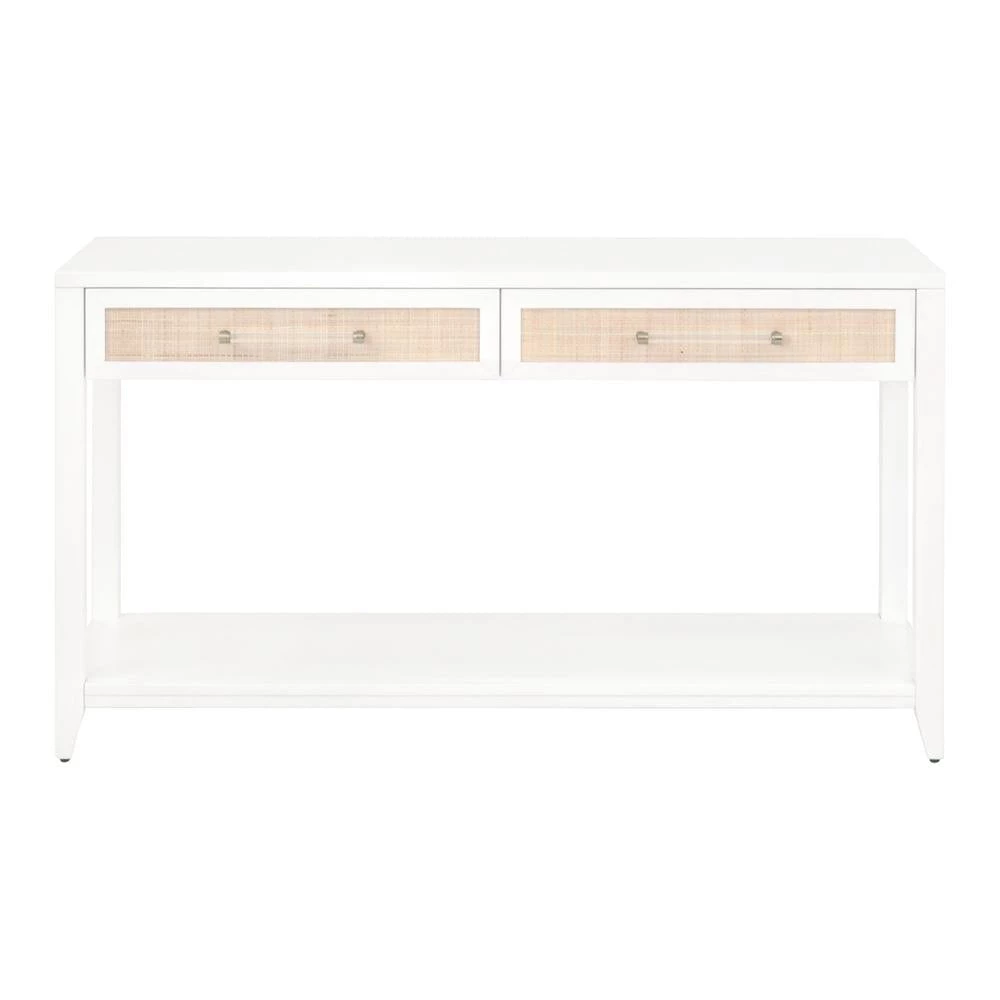 Transitional style 2-drawer console table in matte white featuring natural rattan door front inlay with brass and acrylic decorative hardware.