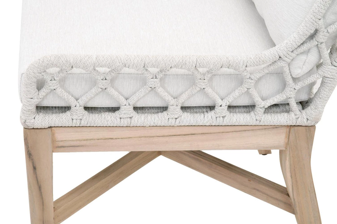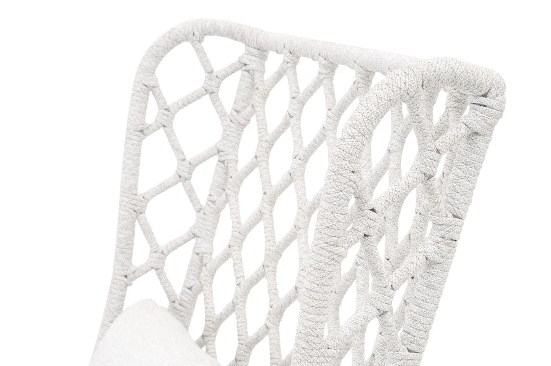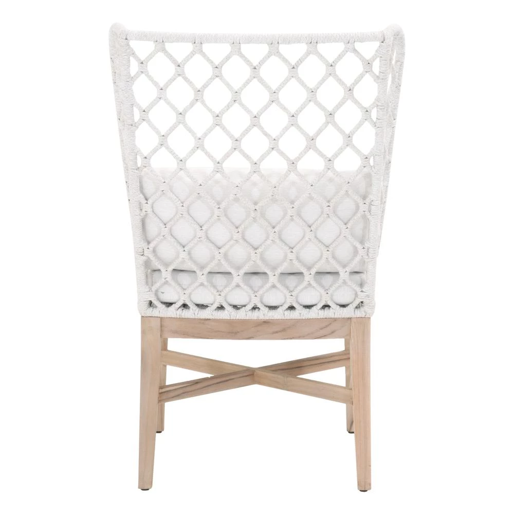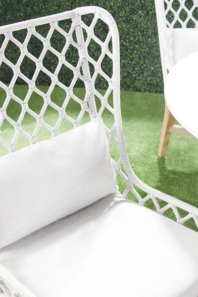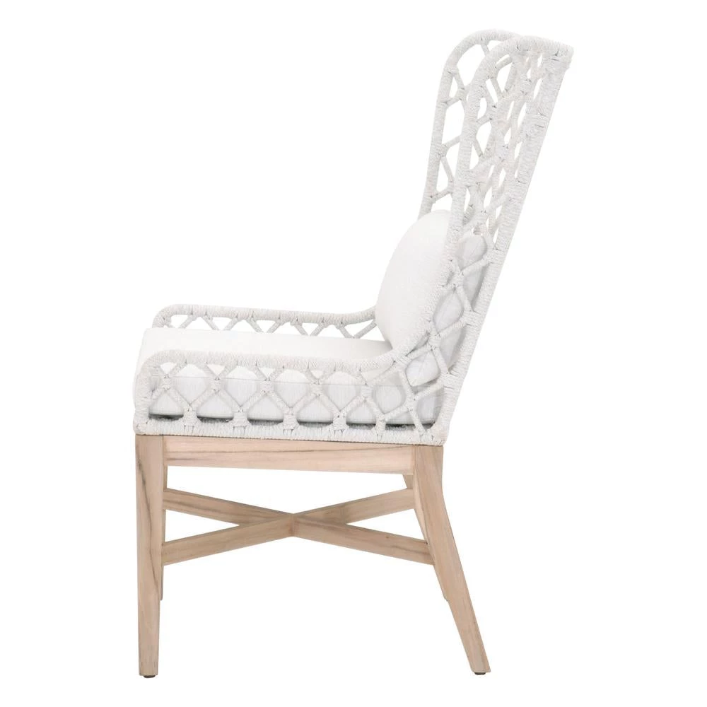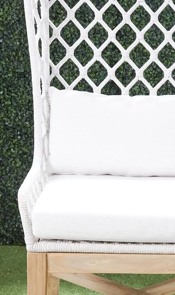 Set the tone of a casual beachy atmosphere with this rope outdoor wingback chair. This dining chair is carefully crafted with an aluminum frame in a lattice-like pattern covered with an intricately woven white rope material. It is constructed with solid gray teak legs that are suitable for outdoor or indoor use. Its removeable seat cushion and lumbar pillow are made of an olefin fabric that is weather resistant and can sustain through light weather conditions (the cushion and pillow should be stored away in extreme weather conditions and heavy rain). Furnish your dining room or outdoor dining set with this coastal-inspired wingback dining chairs.