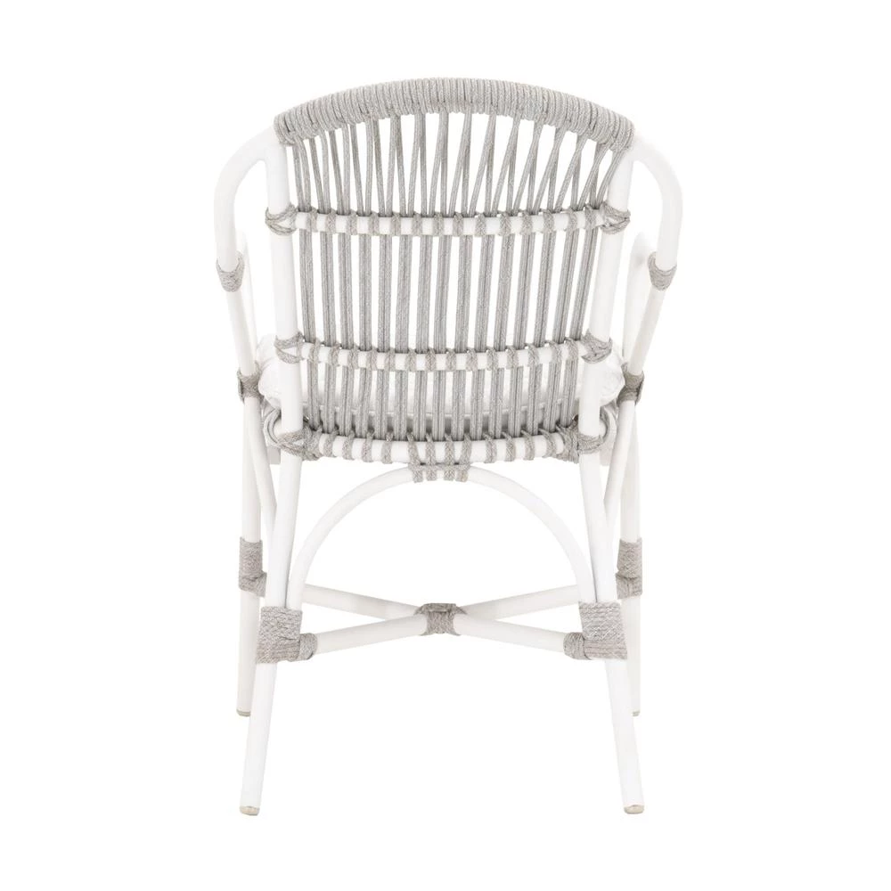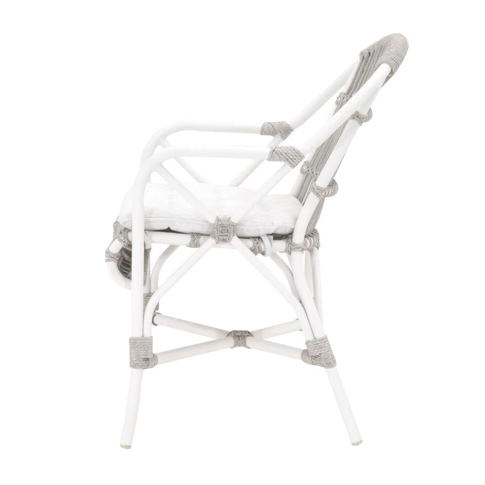 Transitional style outdoor arm chair featuring an intricate rope weave design and an aluminum frame.