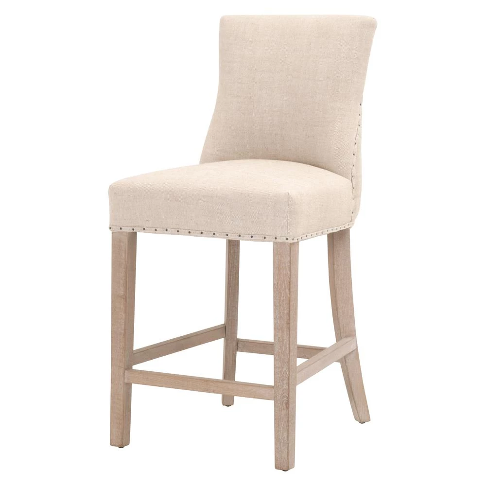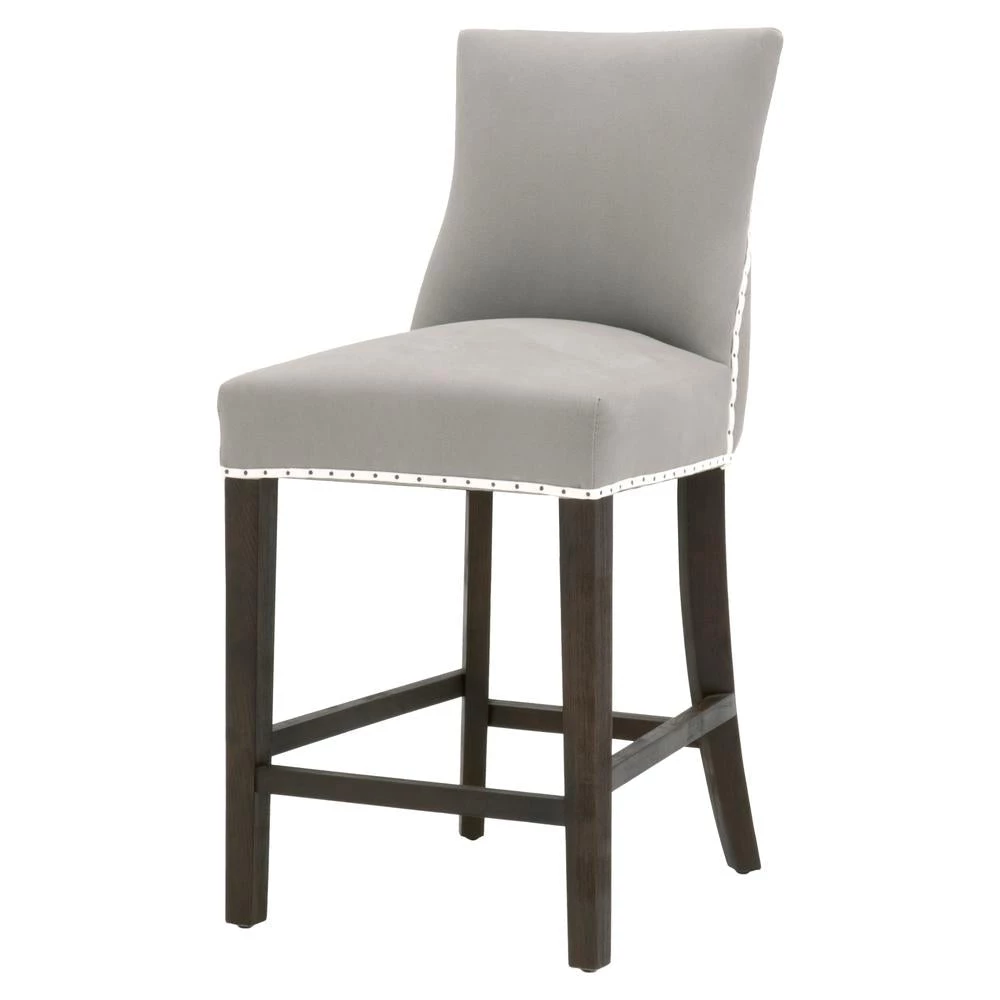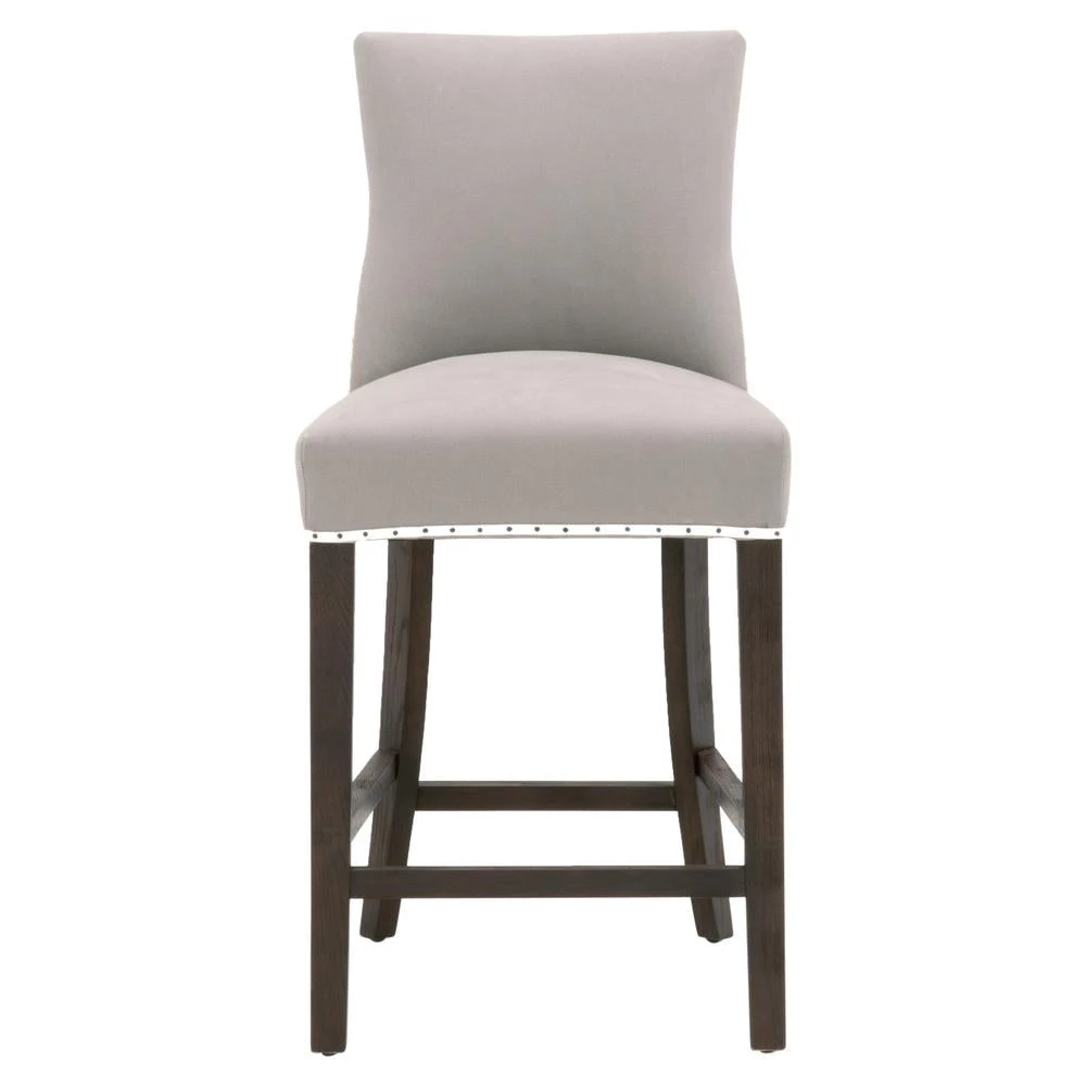 Transitional style counter stool featuring a Rustic Java finish and ash Belgian cotton upholstery.