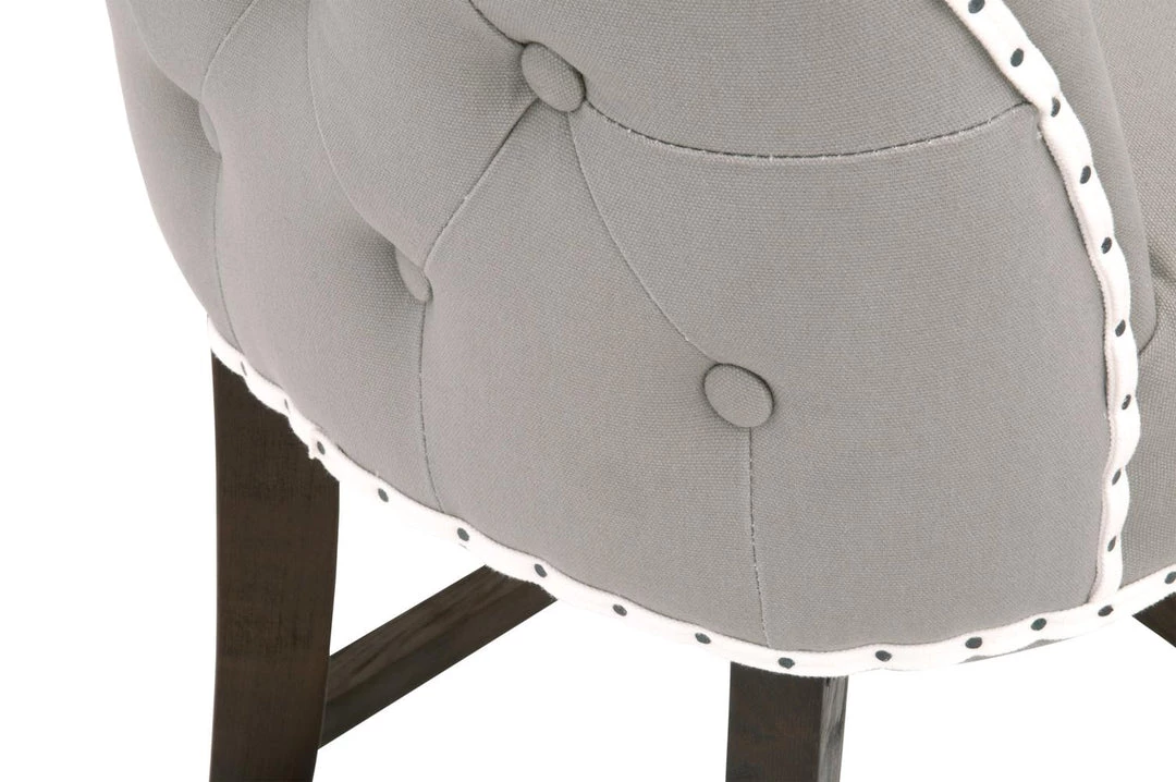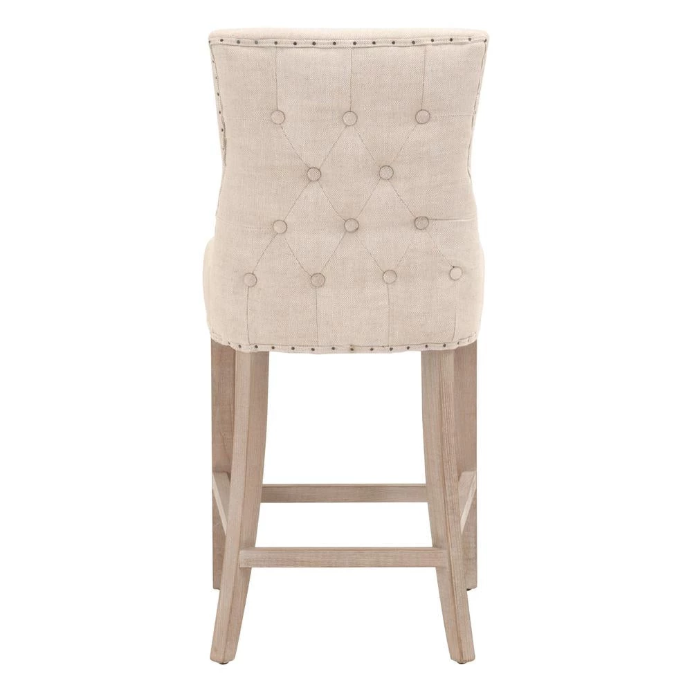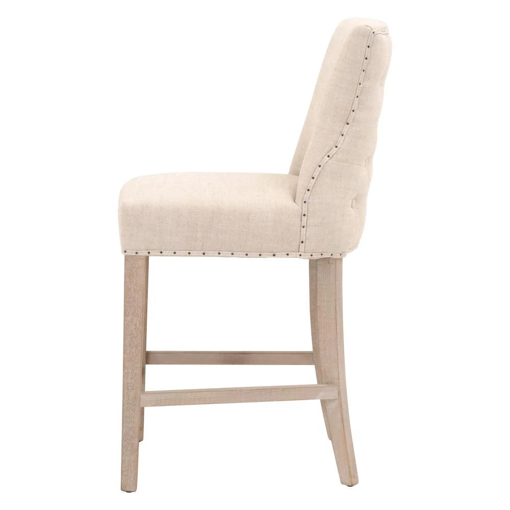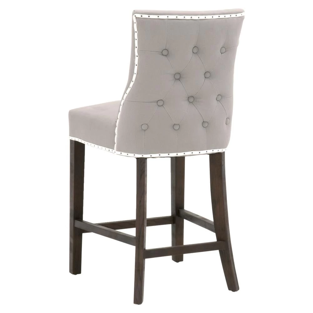 Transitional style counter stool featuring a Rustic Java finish and ash Belgian cotton upholstery.