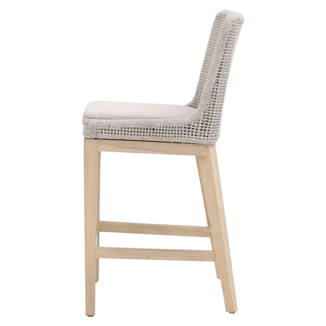 This woven outdoor counter stool will add a touch of coastal style to your backyard or patio. Constructed with a Stainless Steel frame and solid Gray Teak legs, this dining chair is not only sturdy, but durable for outdoor use. A rich Taupe and White colored rope is tightly woven to create a unique mesh design, while the Gray Teak legs feature a beautiful wood grain finish. Paired with a removable all-weather seat cushion, the chair provides comfort with style and will be the perfect addition to any outdoor space.