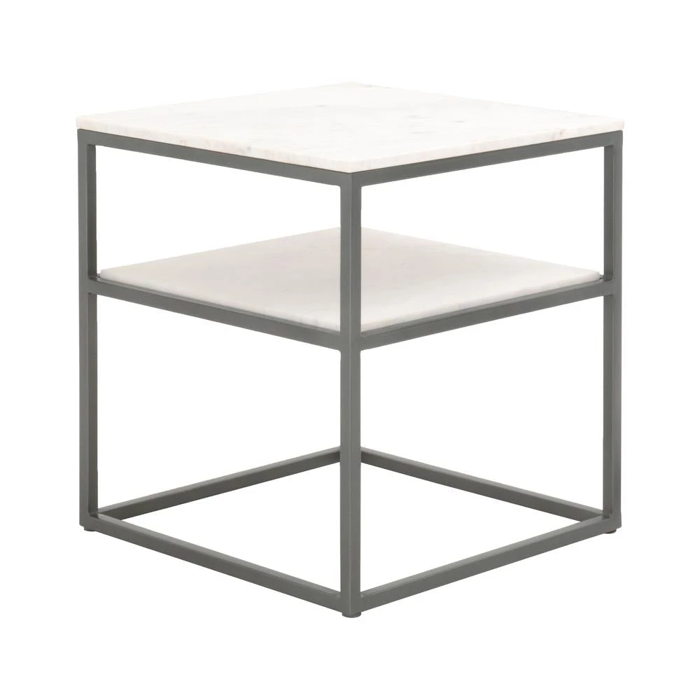 Transitional style square end table featuring 16mm solid marble fixed top and loose inset marble shelf.