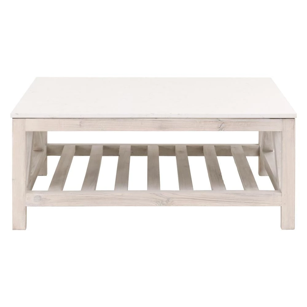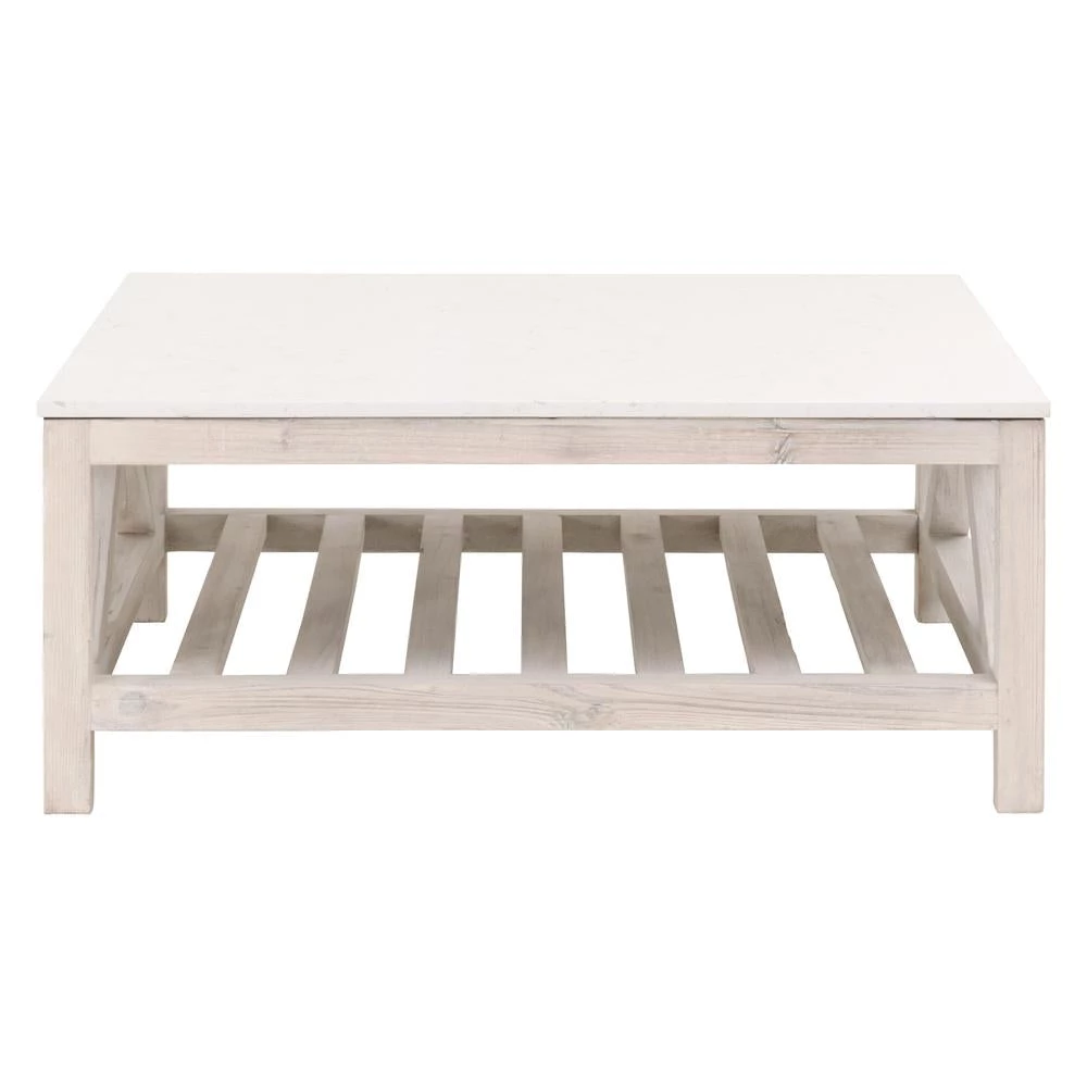 This stunning quartz-topped square coffee table is an eye-catching transitional piece with a touch of farmhouse style. It is constructed with a solid quartz top designed to resemble white and gray marble and a solid wood base with a white-wash finish. The trestle base with gray wood grain adds rustic charm to this modern-looking table. Its light color palette and simple design will pair nicely with many different colors and transitional or farmhouse furniture pieces.
