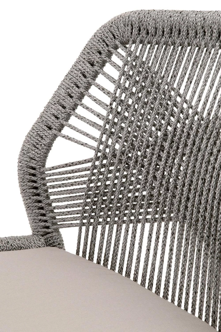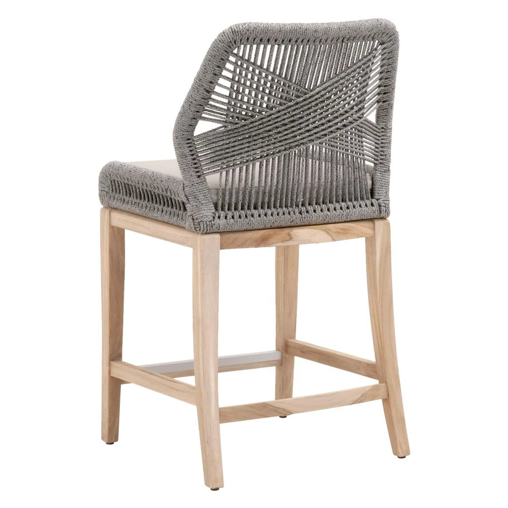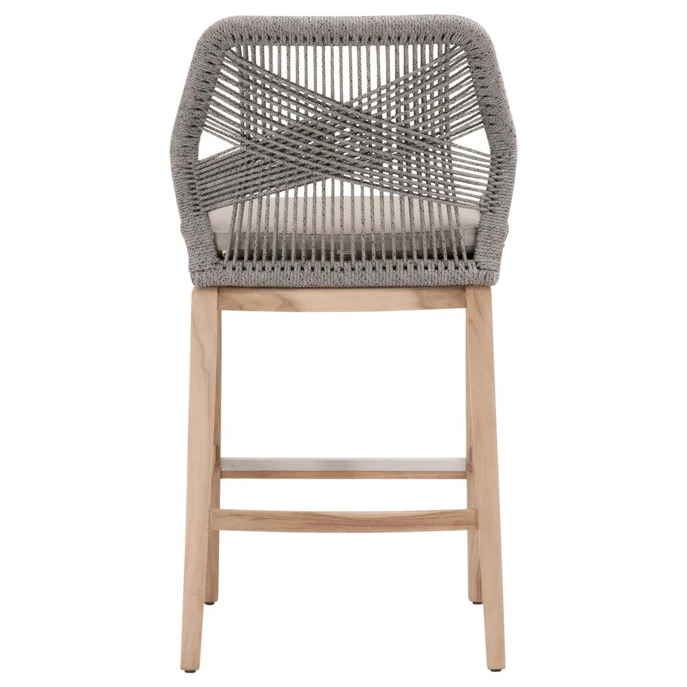 This woven outdoor counter stool will add a touch of coastal style to your backyard or patio. Constructed with a reinforced aluminum frame and solid gray teak legs, this stool is not only sturdy, but durable for outdoor use. A rich platinum-colored rope is tightly woven to create a unique loom design, while the gray teak legs have a beautiful wood grain finish. Paired with a removable smoke gray all-weather seat cushion, the stool provides comfort with style and will be the perfect addition to any outdoor space.