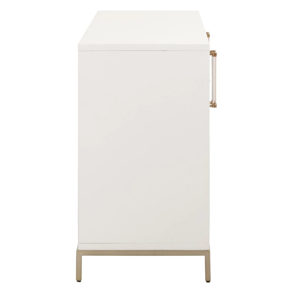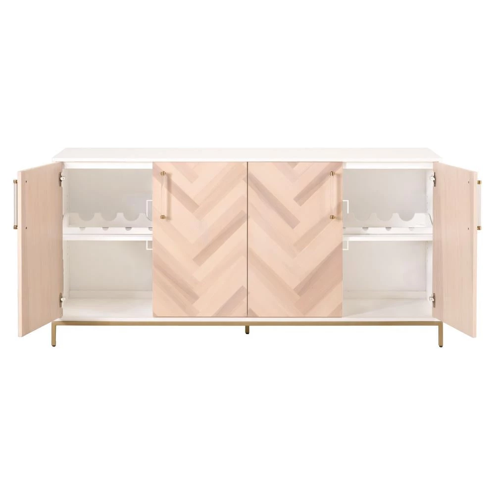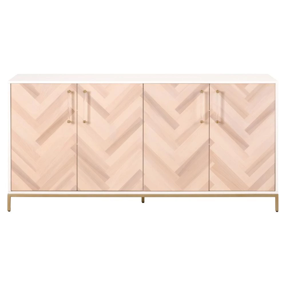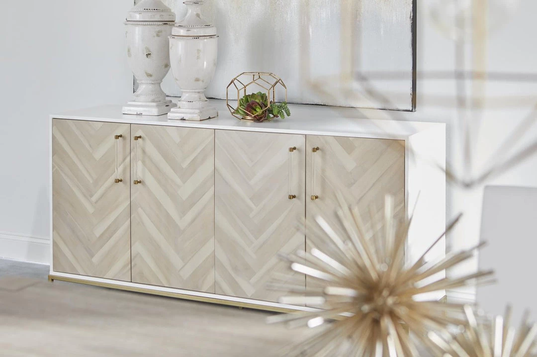 Transitional style media sideboard featuring Herringbone pattern door panels and Matte White finish with Brushed Brass accents.
