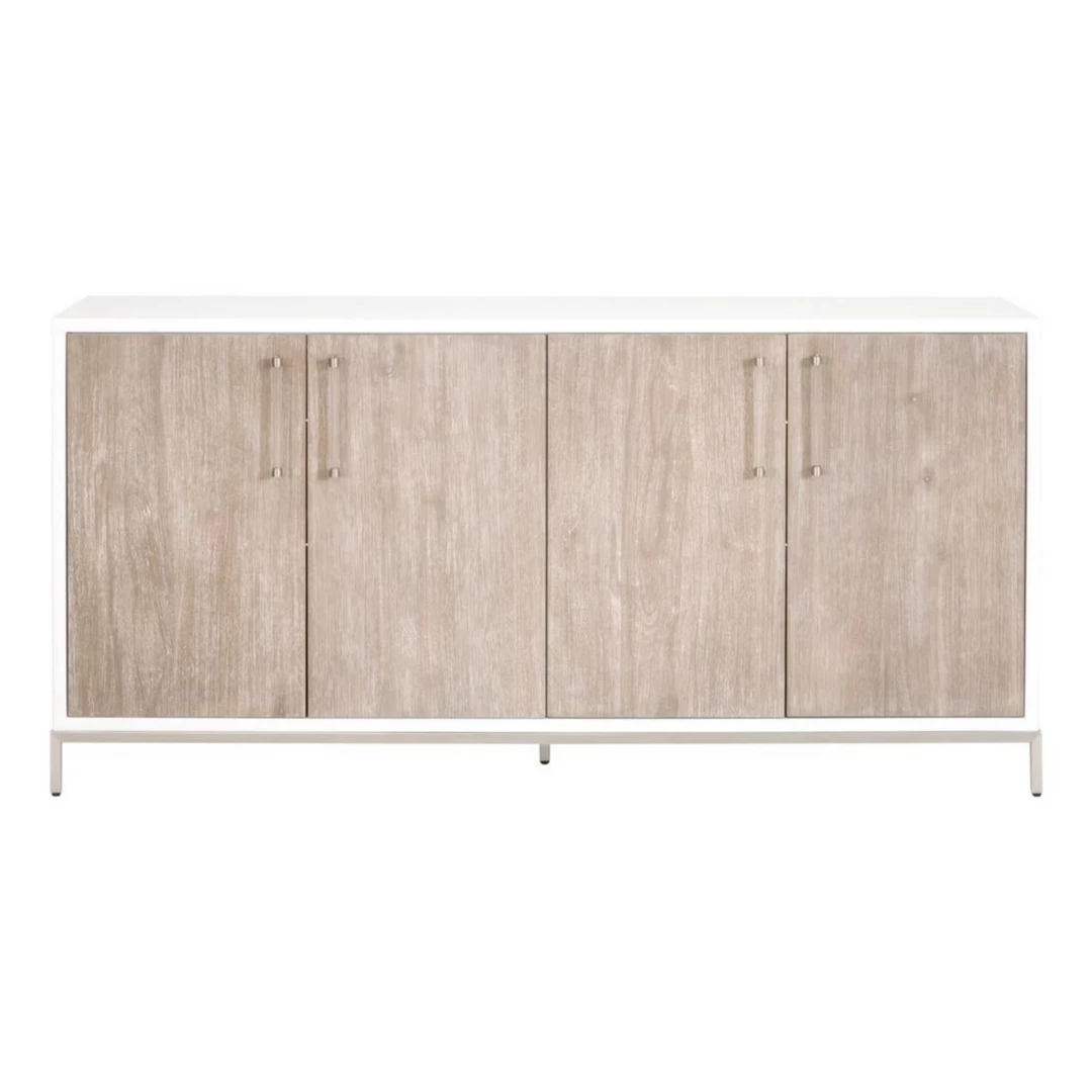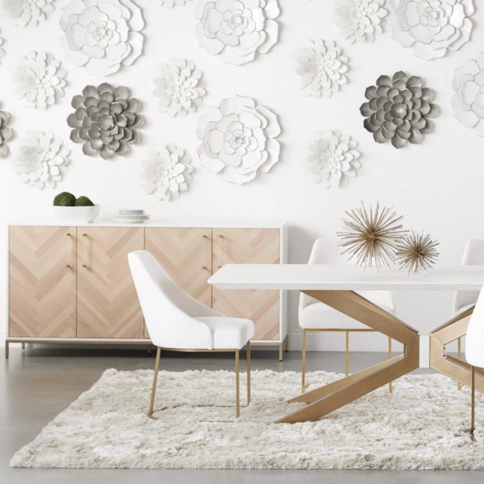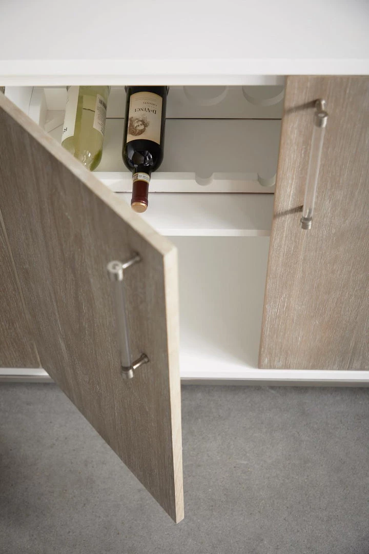 Transitional style media sideboard featuring Herringbone pattern door panels and Matte White finish with Brushed Brass accents.