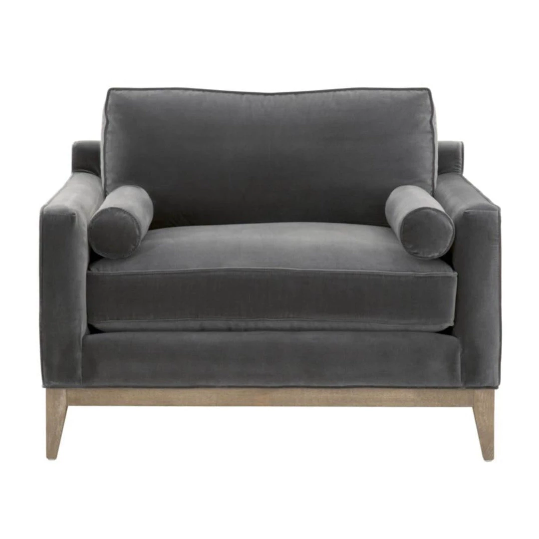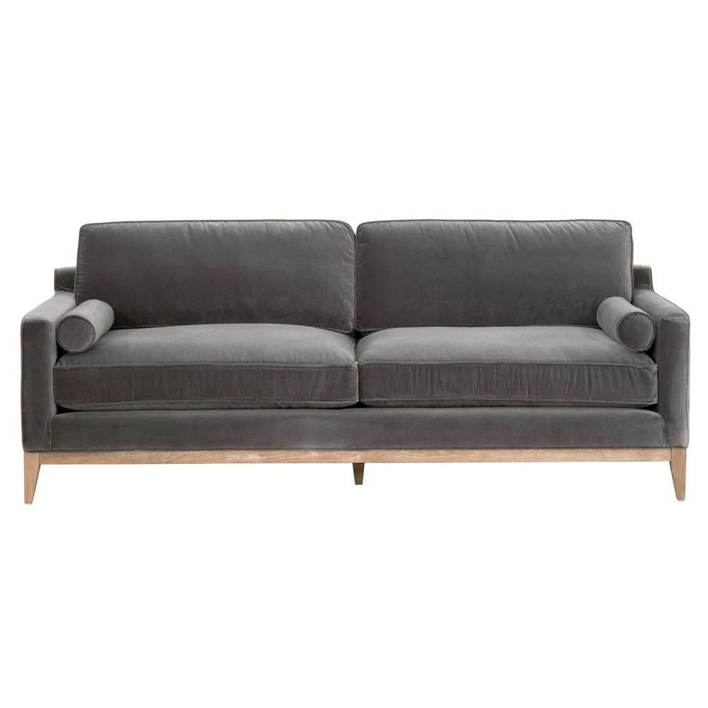 Transitional style sofa featuring Dark Dove Velvet fabric upholstery with reversible seat and back cushions.