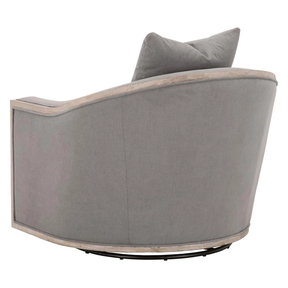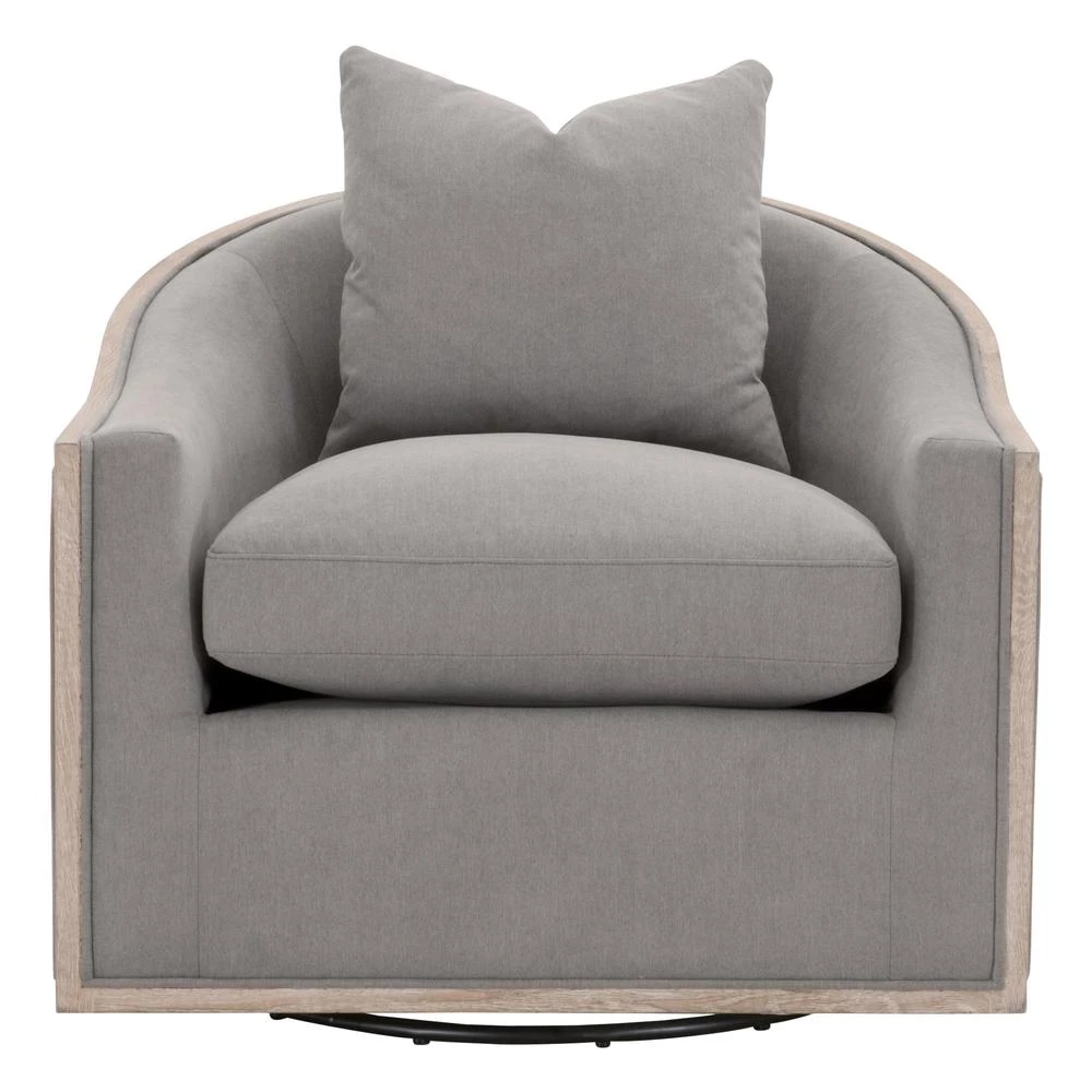 Furnish your living space with this transitional club chair. Constructed with a barrel-shaped design and sloping arms, this club chair has a relaxing and cozy appeal. It sits on a 360-degree swivel for easy turning and spinning. It features a reversible plush seat cushion made of a down blend and foam filling, along with a down throw pillow. The upholstery is made with a gorgeous white high-performance fabric that makes cleaning easy. Solid oak wood with natural gray tones trims this unique club chair, adding depth and character to the chair. It will fit well in many settings including traditional, beachy and transitional.